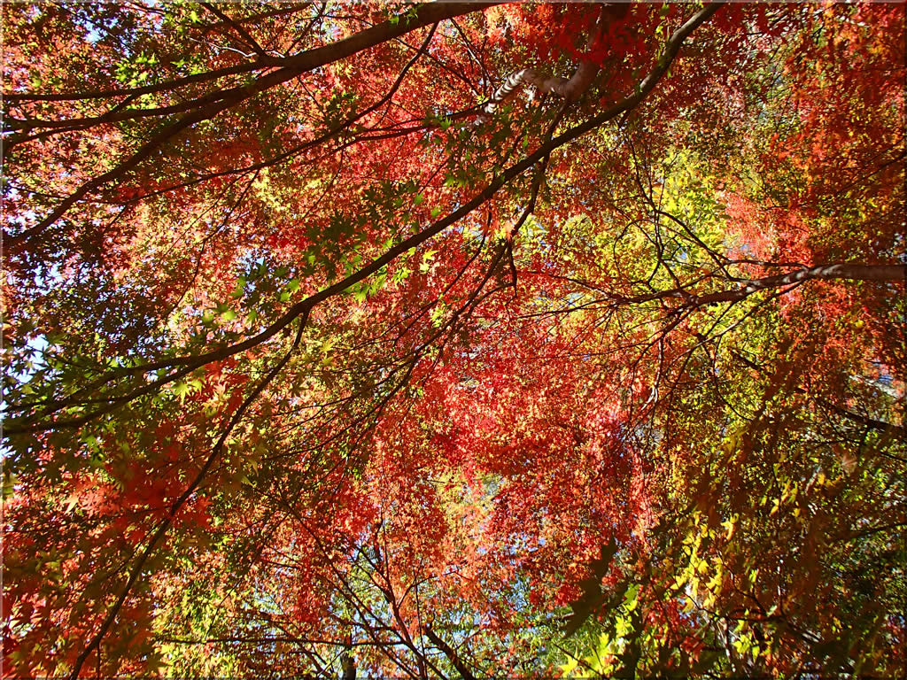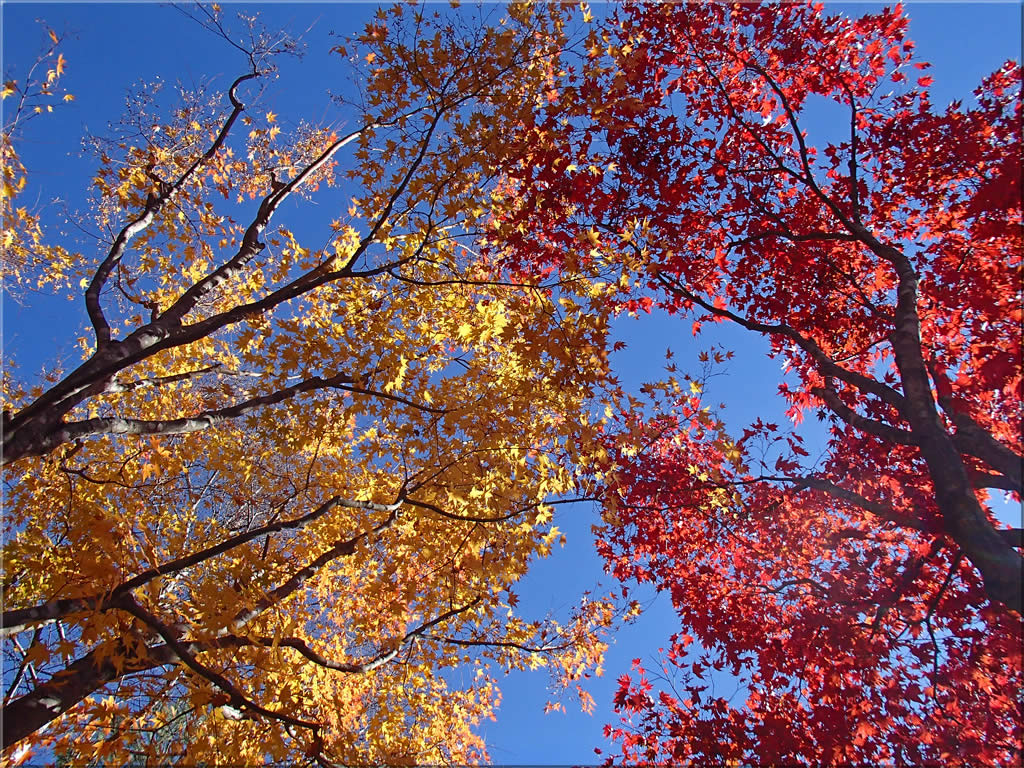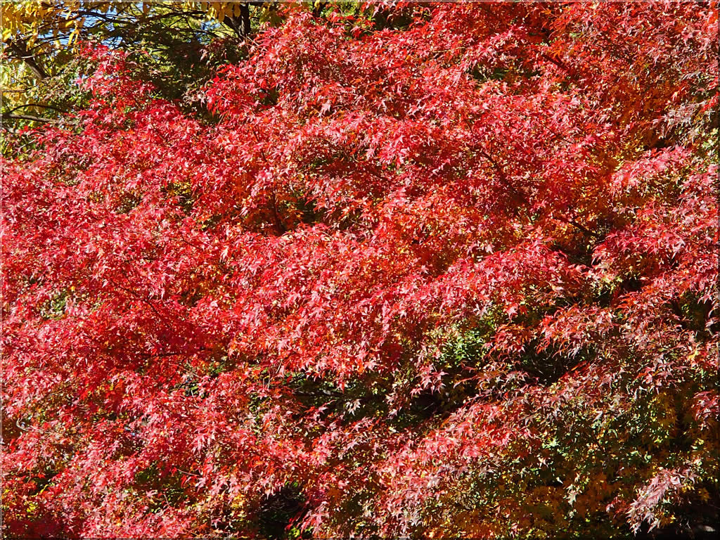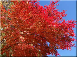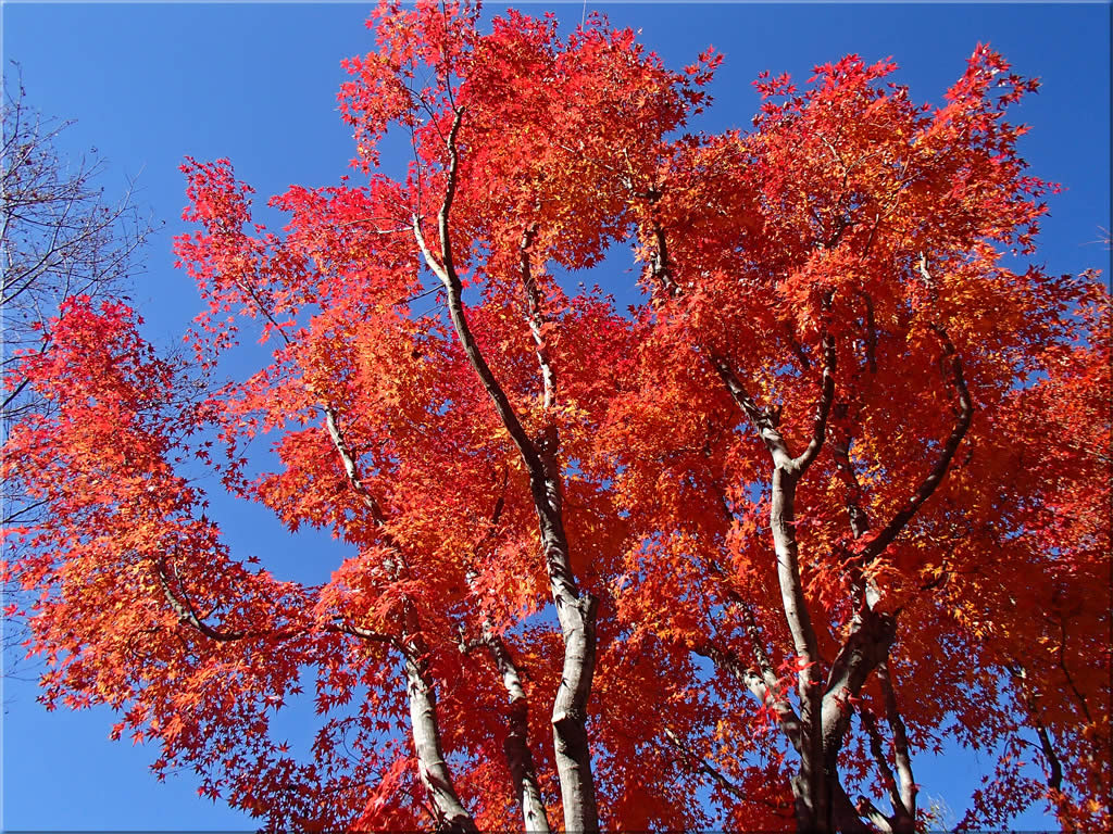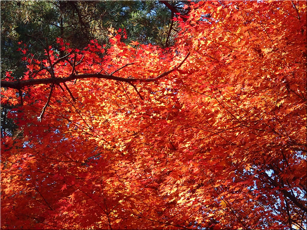 日射しに照らされて、紅葉がまるで燃えさかる炎のようです。