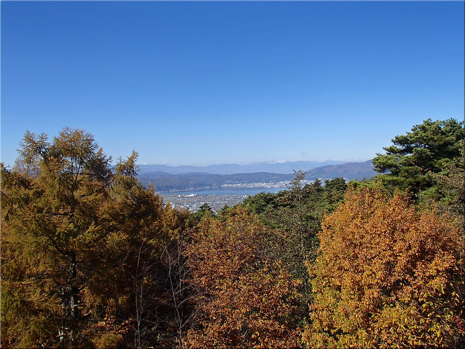 ちょうど正面に守屋山が、そして少し右下に諏訪大社上社が見えています。