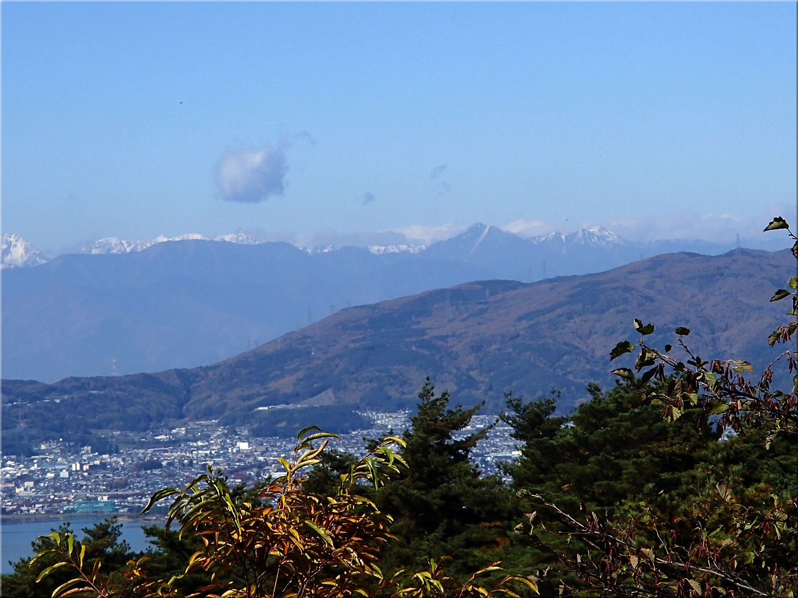 この遊歩道にはところどころ見晴らしの良い場所があります。次の場所からは北アルプス槍穂高が見えます。