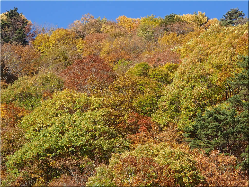 登ってきた斜面をズーム。良い色合いの黄葉が随分と多いです。