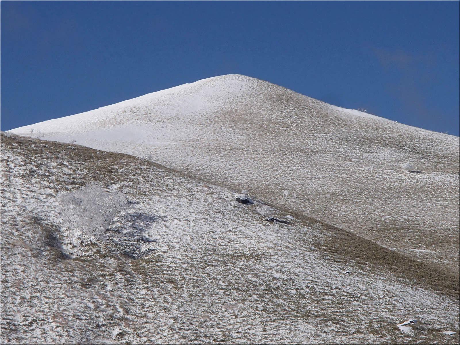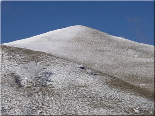 三峰山をズーム。かなり白く見えますが、でも滑るのはまだ無理かな(^^;。なお登山道がほぼ埋もれていますので、あのあたりは積雪が30cmほどはありそうです。