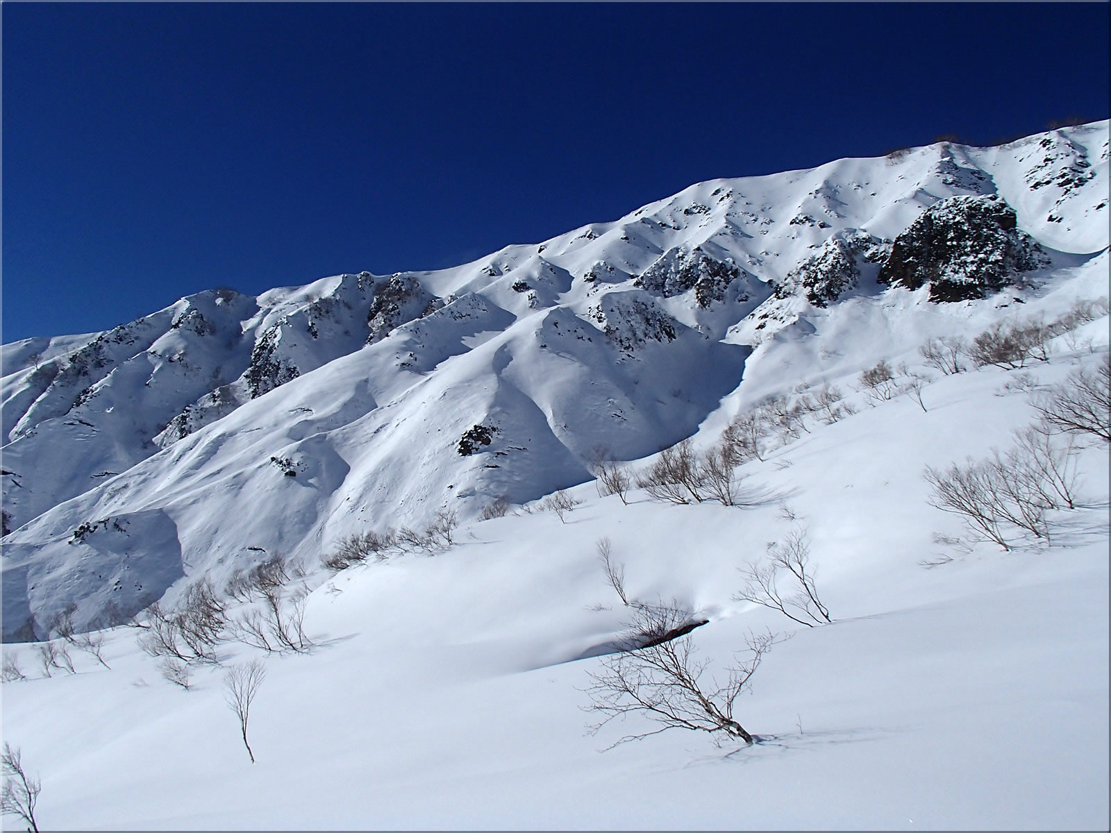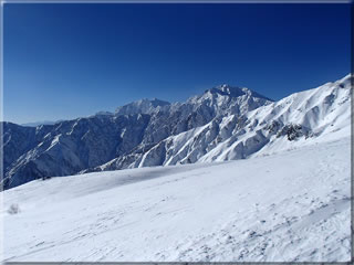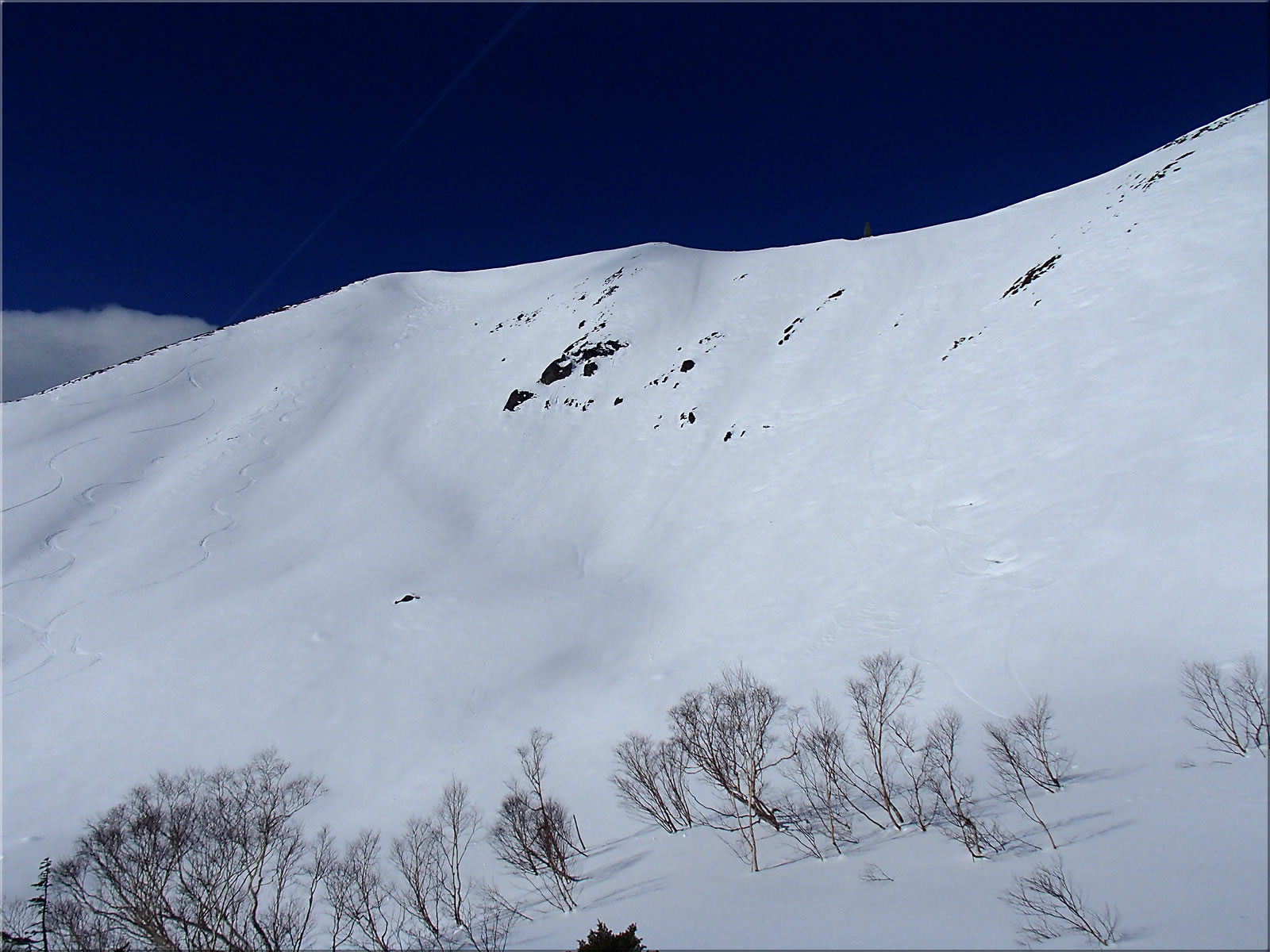 いつも滑っている(そして今回も滑った)八方沢上部の斜面をズーム。この斜面は雪が吹きだまりやすく、もう岩やブッシュなどは出ていません。あと心配なのは今回の雪質です。