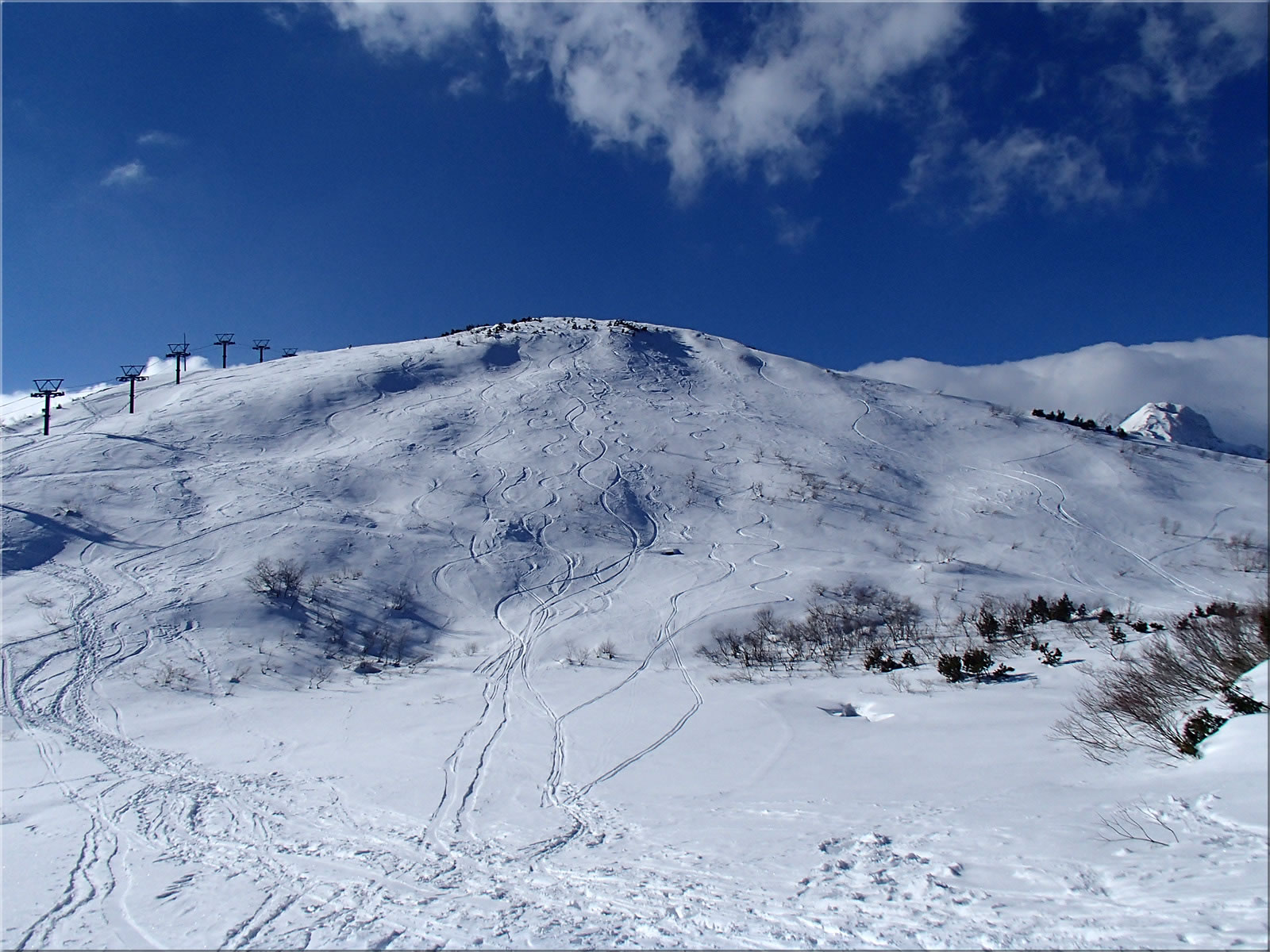 尾根上でも東側の吹きだまりではまあまあのパウダーを楽しむことができました。