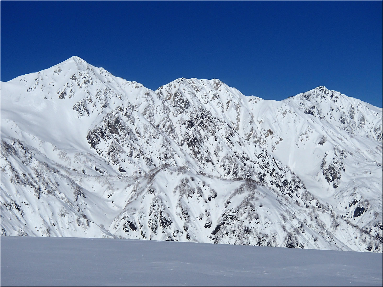 八方尾根上部、唐松岳(右側に見える三角形のピーク)をズーム。