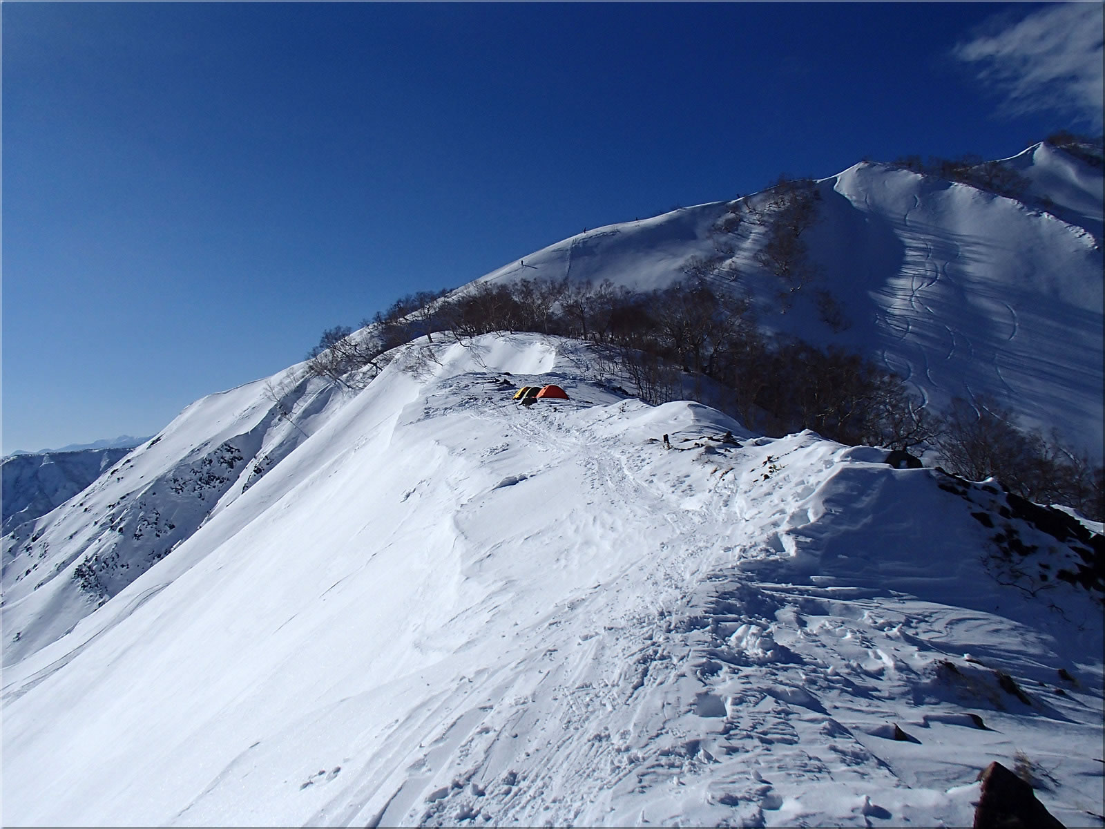 稜線が狭くて急になる部分だけ、少し風が強くて雪煙が舞っていました。この先はびゅーびゅーかと覚悟したのですが、風が強めだったのは結局ここだけでした。