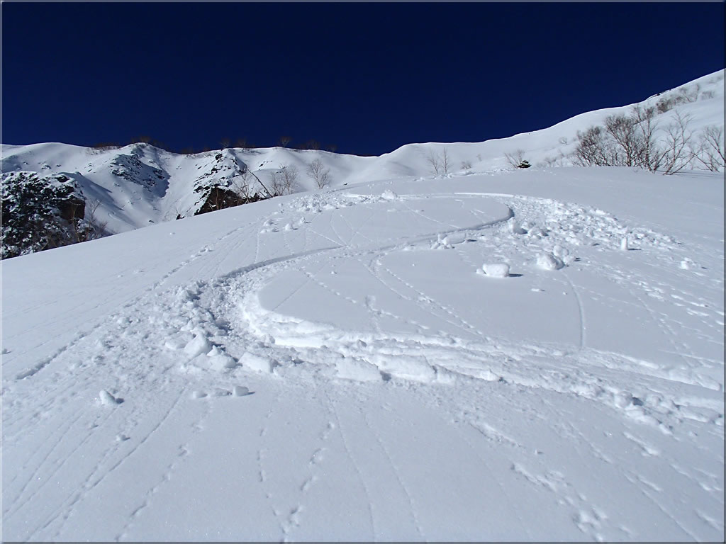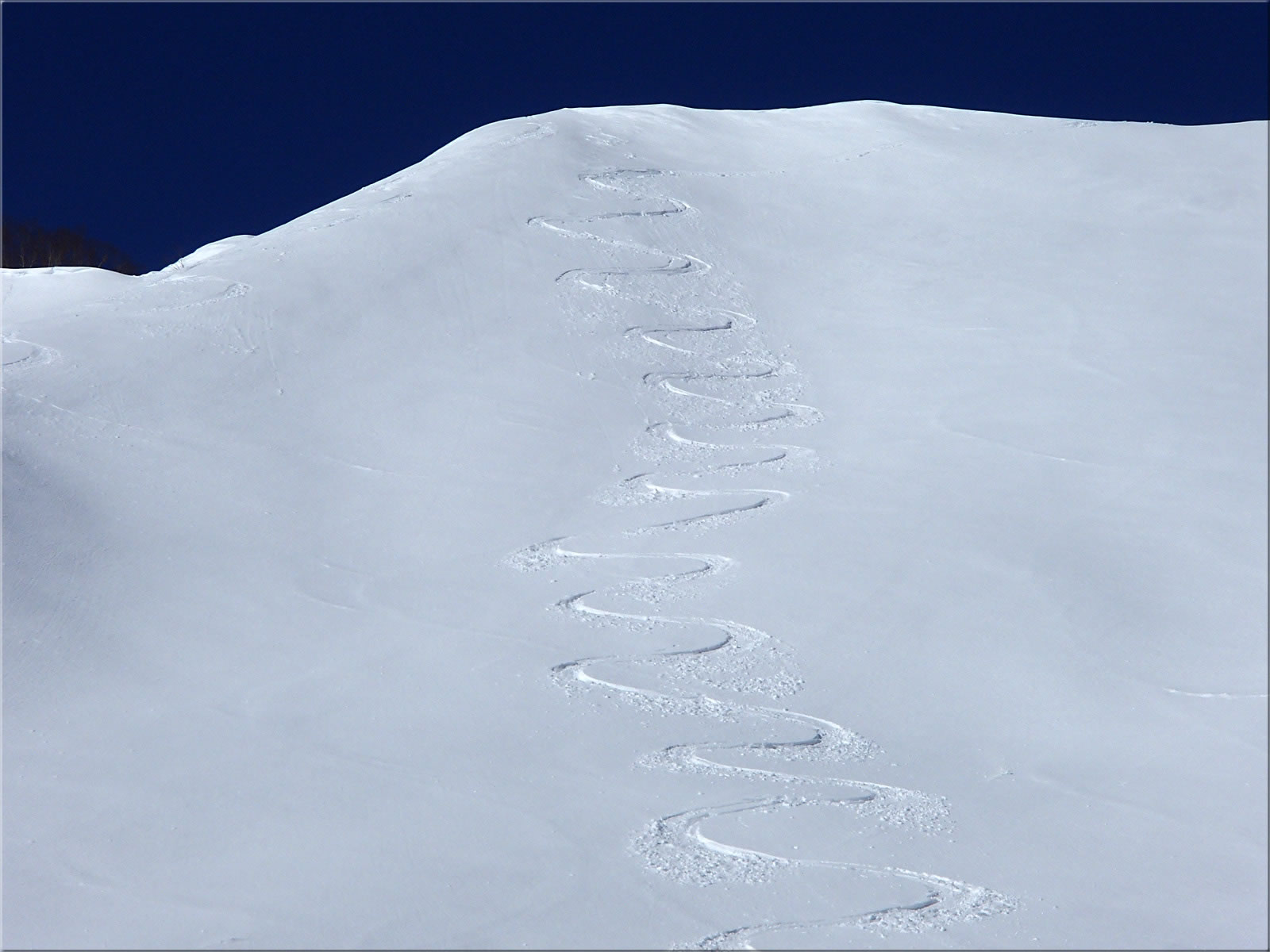 最後にもう一度先ほど滑り降りた斜面を振り返ります。私の隣にシュプールが増えていました。