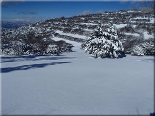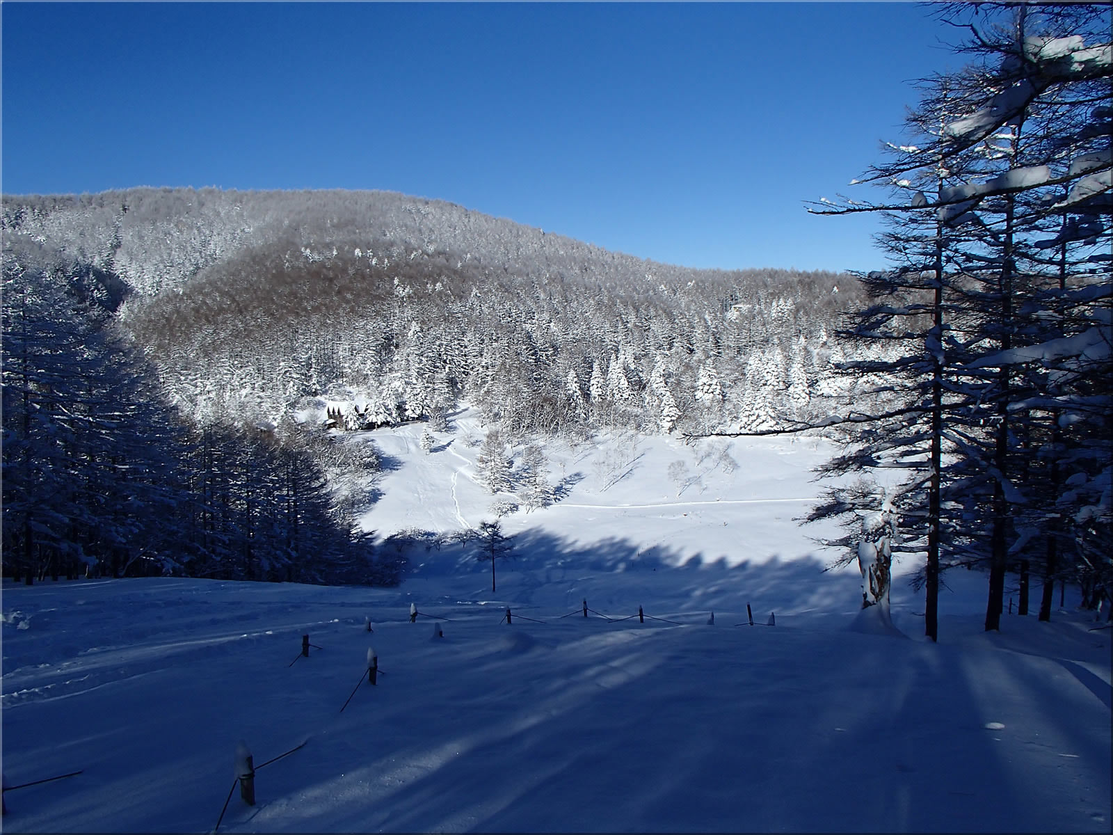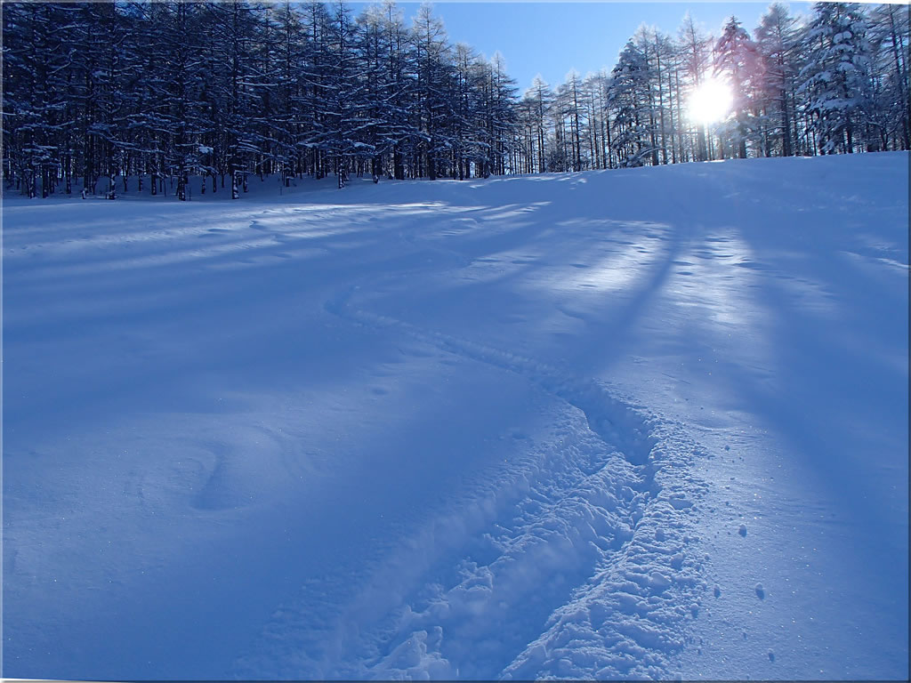 直滑降でなんとか停まらずに下まで滑り降りることが出来ました。陽当たりの良い斜面ですが、極寒ゆえに雪もさらさらのままでした。