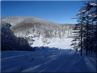 そして今回もこの牧場の斜面を滑り降りてみます。後半の下りラッセルが心配ですが(^^;。