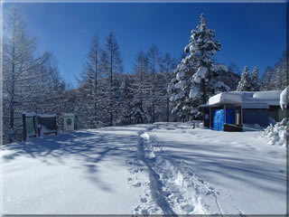 入笠湿原の斜面を滑りたいので、登山道には進まず、林道の方に進みます。