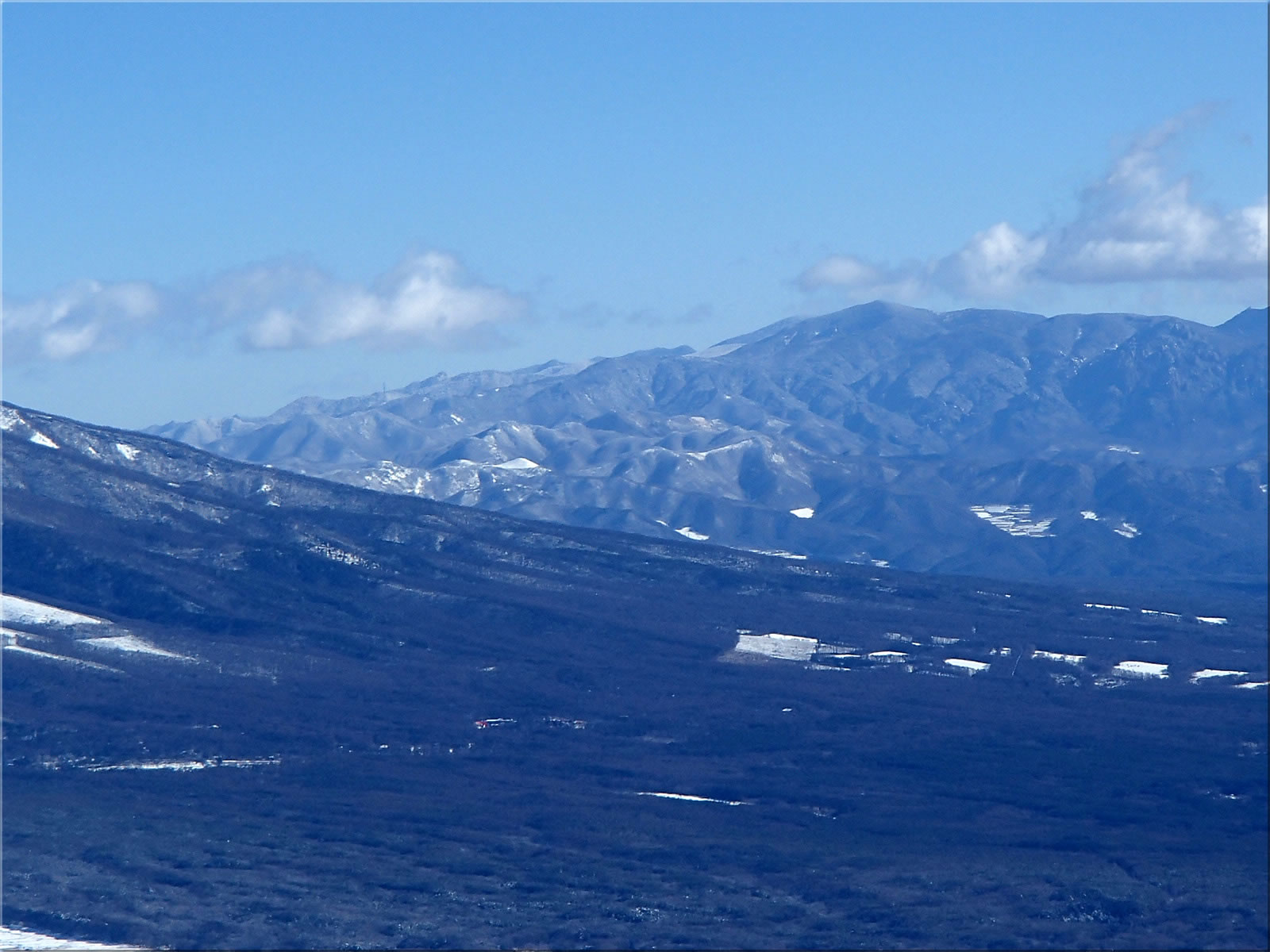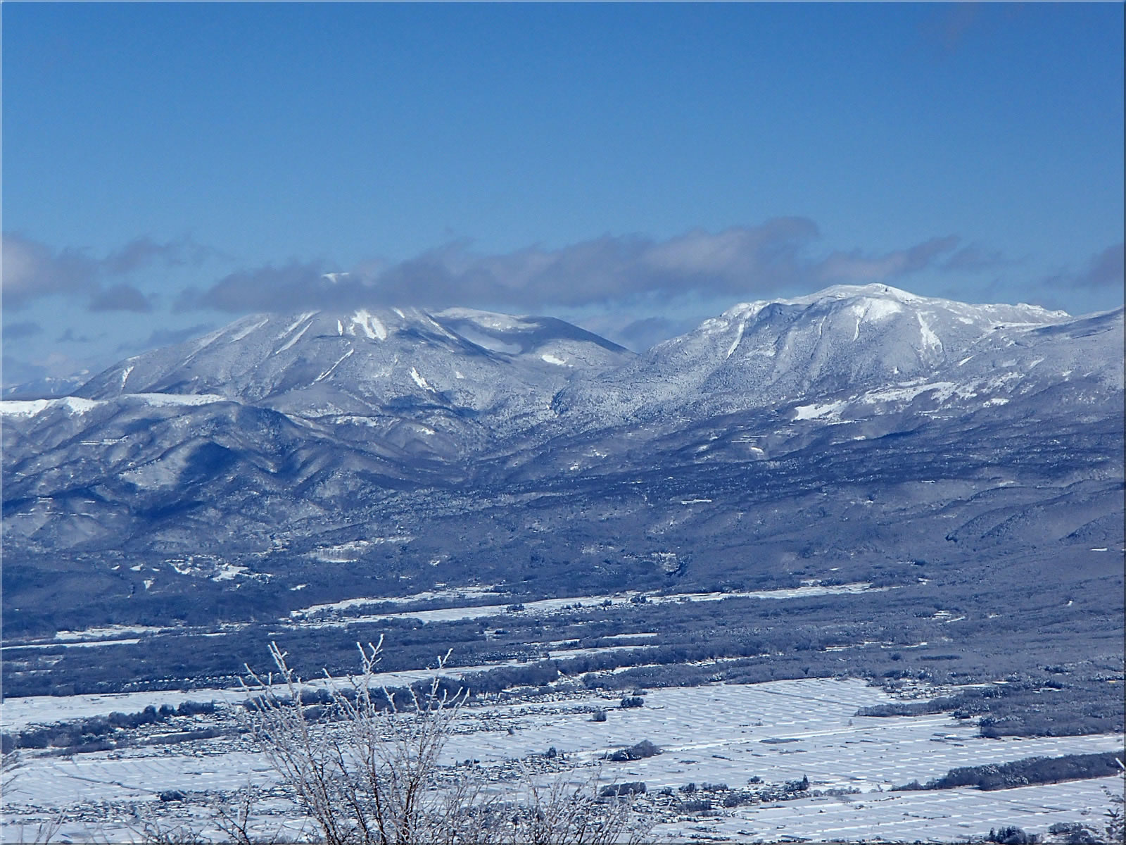 飯盛山方面をズーム。多分中央少し左側の真っ白な小さい山がそうだと思います。