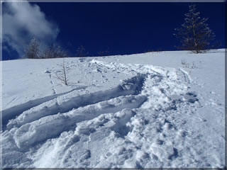 今の斜面を滑っている途中でスノーシューの登山者が一人先行しましたので、ここからはラッセルは無くなり助かりました。ありがとうございます。