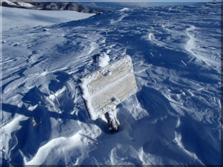 直登ルートの途中にあるこの標識がルートの目印になります。また最後に北面西側斜面を滑り降りる時も、この標識から北側斜面に入っていくと分かりやすいと思います。