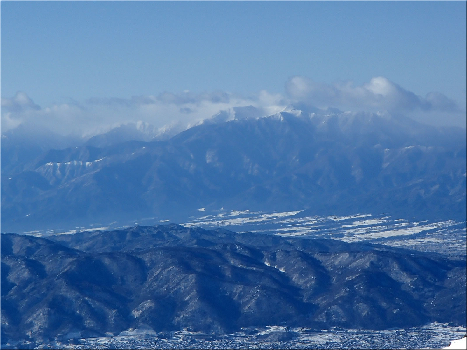 後ろを振り返ります。北アルプスもおそらく雪雲がかかっていると思いますが、その手前の雲の帯が邪魔して見えません。