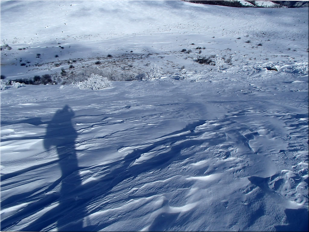 雪ですが、強風でパックされた感じでさらさら感はありません。斜面を見ても分かりますが、どうやら一昨日の降雪後の強風で、新雪は吹き飛ばされたかパックされてしまったようです。ま、スキーだとほとんど沈ますに歩きやすいのはありがたいですが、さらさらパウダーを期待していたのでかなり残念です。でも北面はきっと裏切らないことでしょう(^^;。