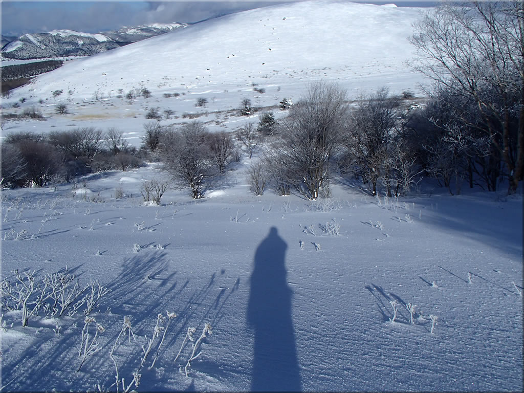 滑る準備をして9時50分、上ってきた登山道を滑り始めます。ま、この辺りはほとんど平らで歩くスキー状態です。