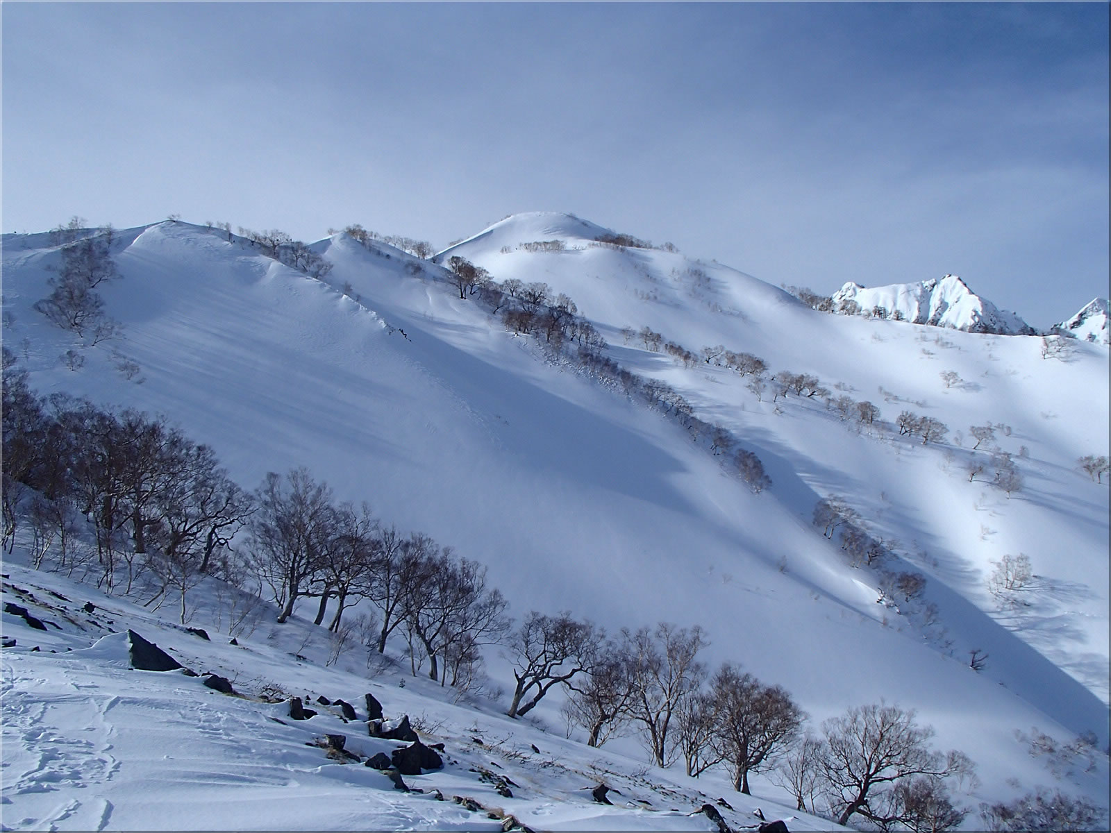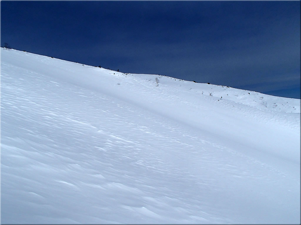 北側の斜面のほとんどは風でたたかれてかりかりになっていました。おそらく少し下れば吹きだまりがあるのでしょうが、登り返しで最後にかりかりの急斜面を緊張して登るのはパスかなと、今回も稜線から柔らかそうな?南面側を滑ることにしたのでした。