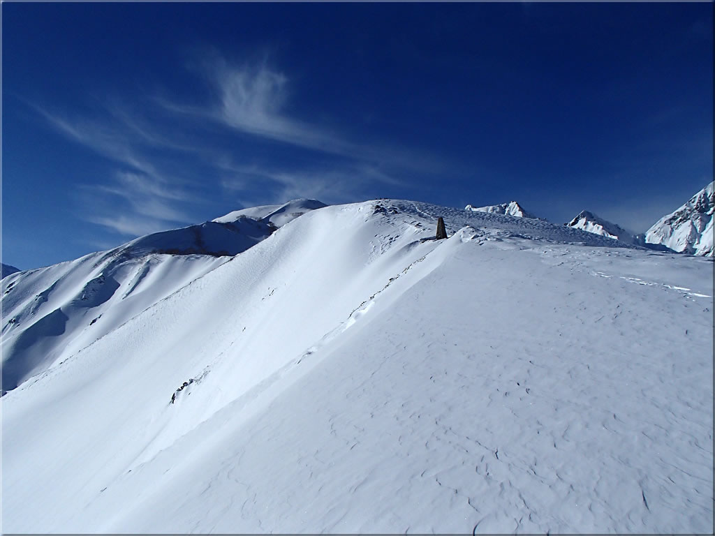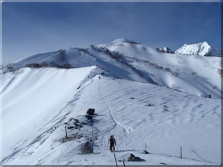 見渡す限り、全ての斜面で昨日吹き荒れた強風の影響が見て取れますが、稜線も雪が吹き飛ばされてかりかり状態のところが多かったです。ただ登る7割ほどの人はボーダーでスノーシューで歩いていますので、適度に表面が削れてなんとかシールで登っていくことが出来ました。
