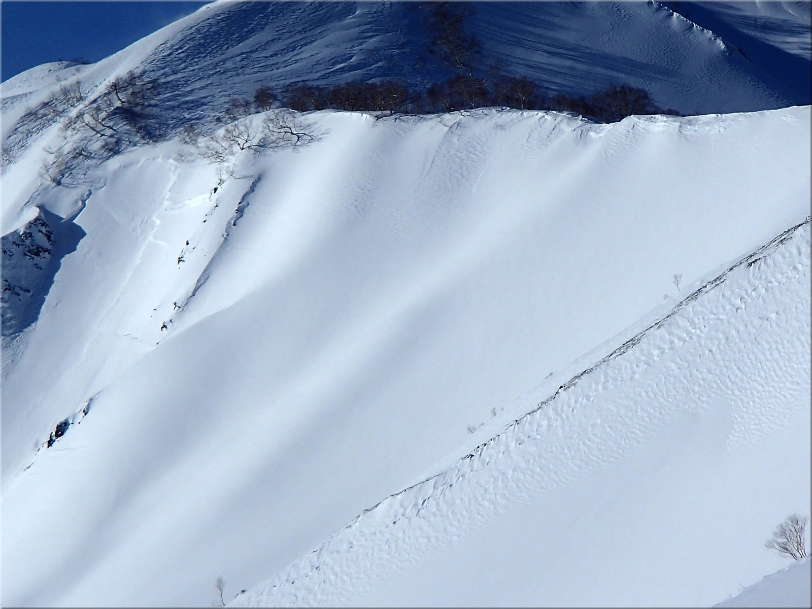 下の樺手前のドロップポイントに到着。稜線のシュカブラの様子を見ると、昨日の暴風は写真右手(西側)から吹いていたのが分かります。従い左側の斜面は吹きだまりになっているはずですが、あまりの強風にハードパックされていないことを祈るばかりです。