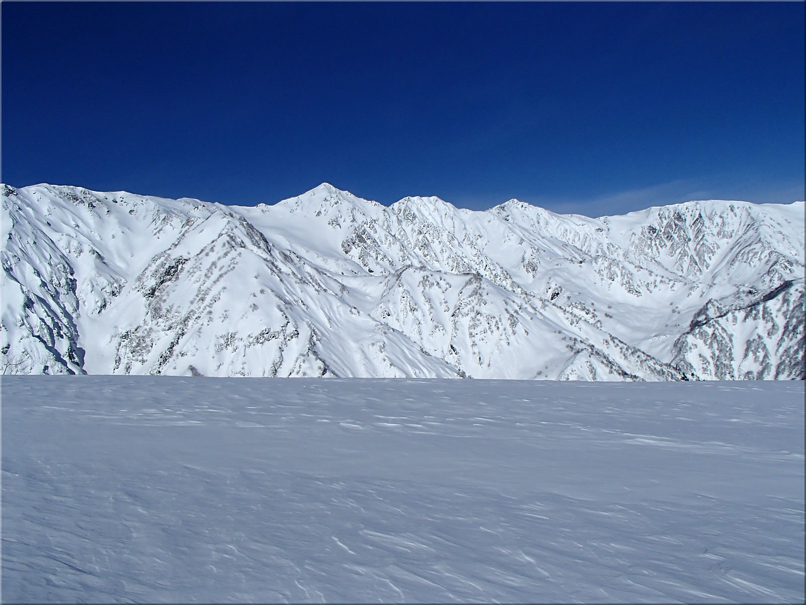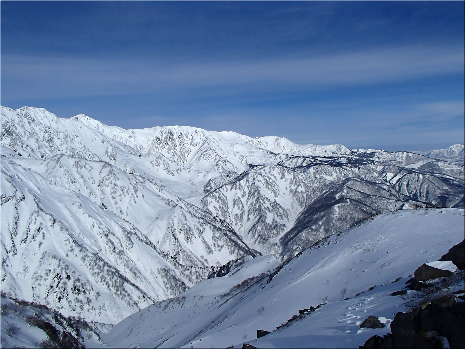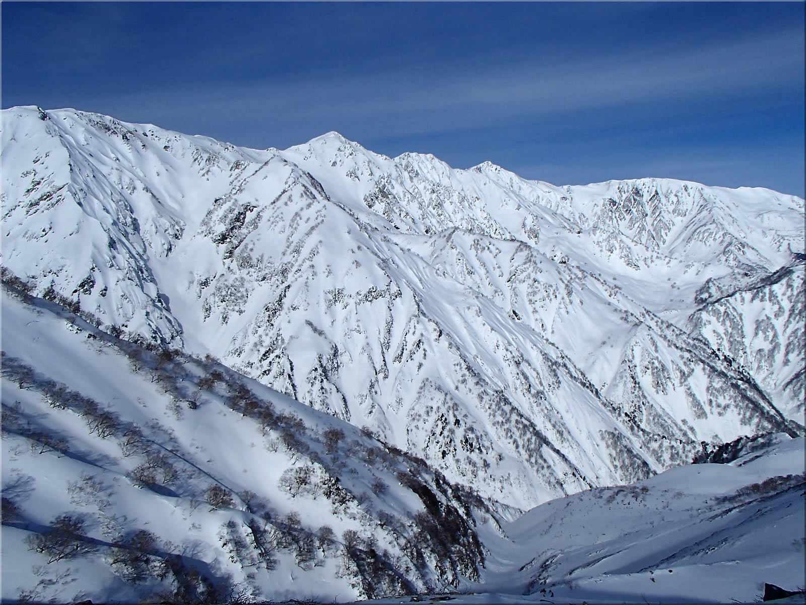 白馬乗鞍岳、天狗原をズーム。向こうも雪は増え、滑るのは問題無さそうです。