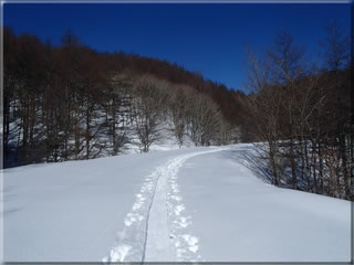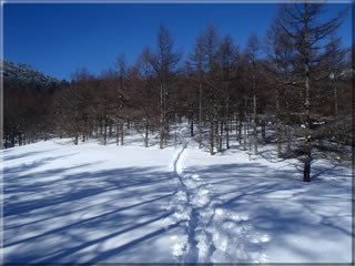この辺りの雪は意外にもさらさらで30cmほど積もっています。これなら進行方向左側に見える斜面あたりも雪がよいのではと言う話になり、今回は東側斜面ではなく、南向きの斜面を最後に滑ってみることにしました。