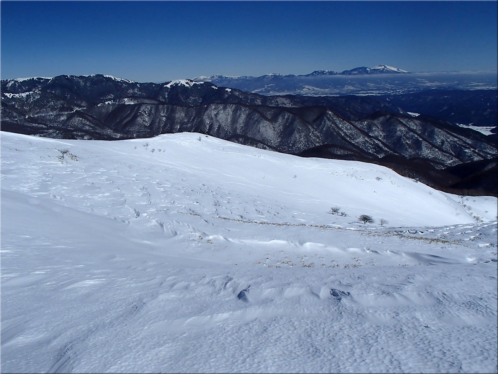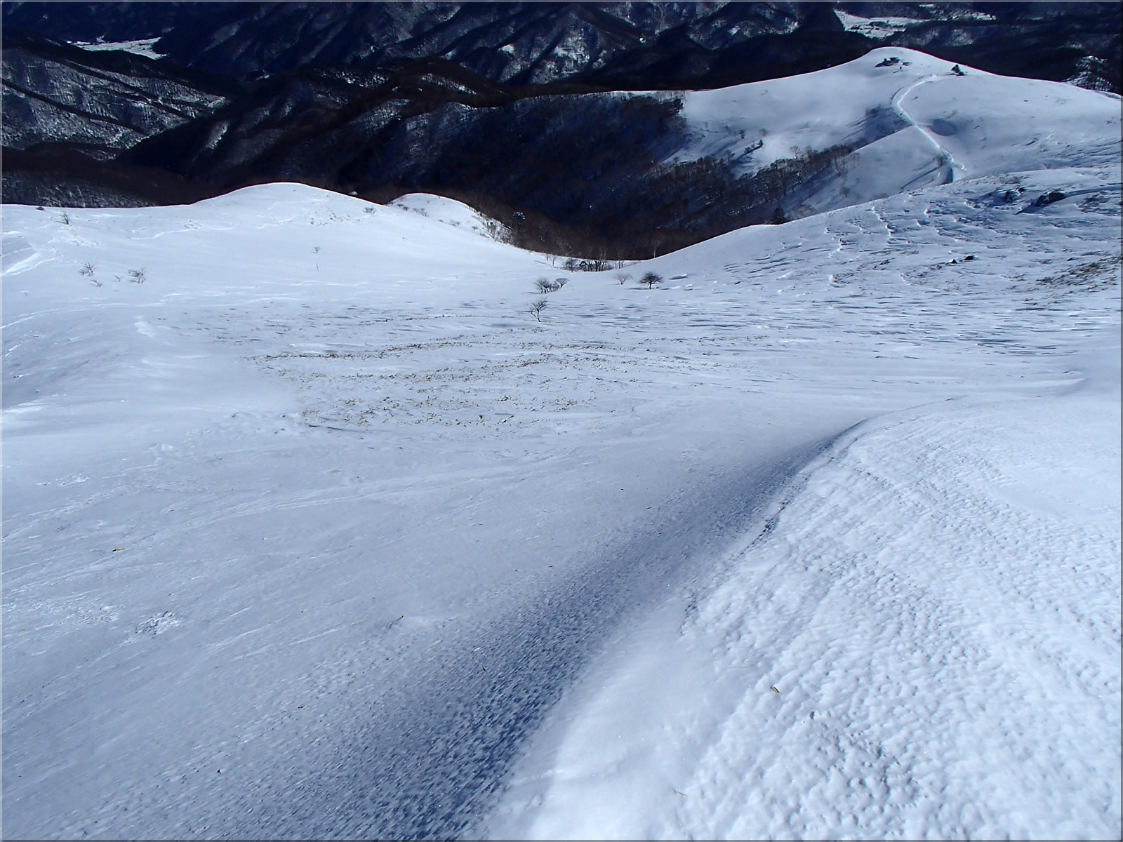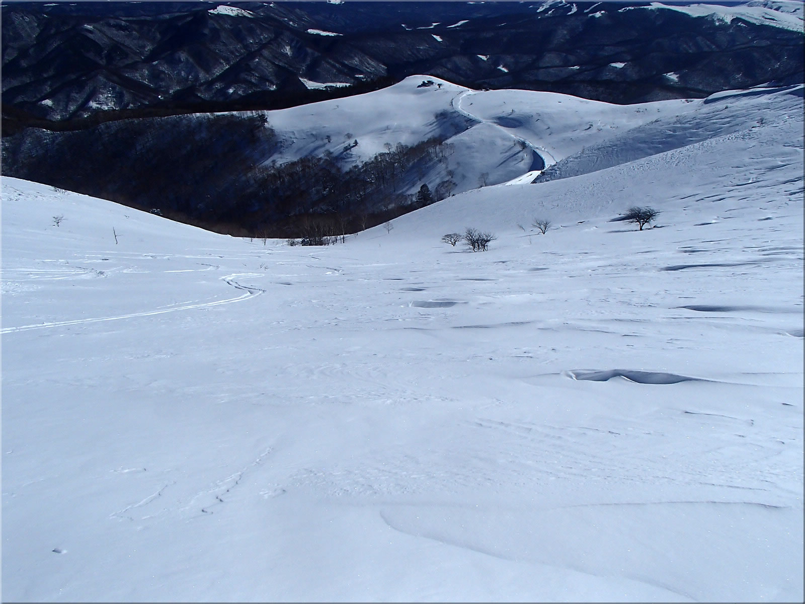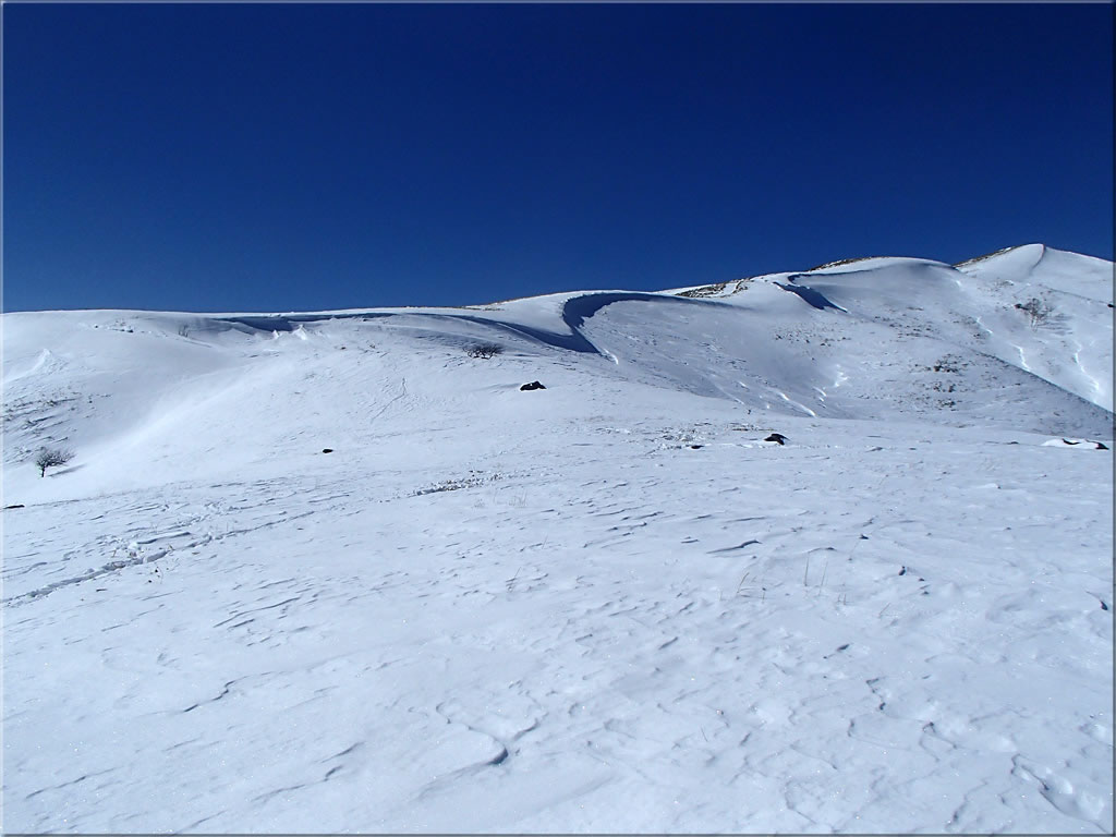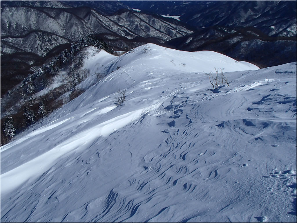 この辺り、雪はさらさらでした。この稜線をスキーで滑った跡が付いていました。