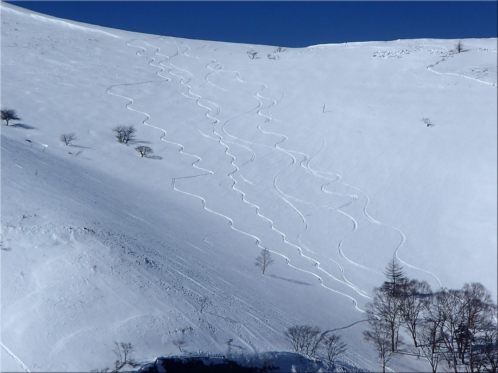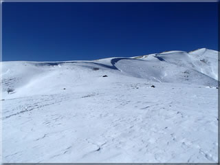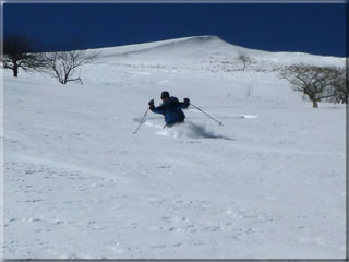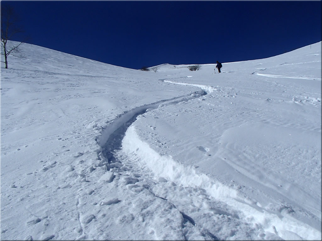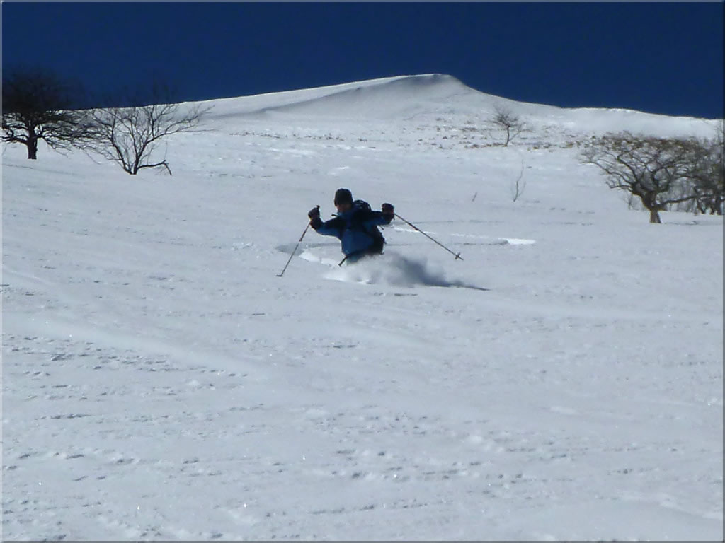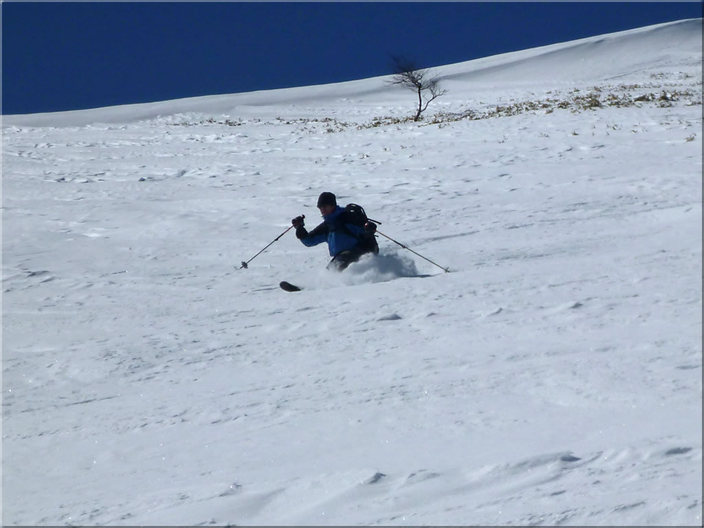 滑った斜面の雪が予想以上に良く(あの雪のないかちかちの稜線からは、すぐ下の斜面の雪がこれほど良いのは予想出来ませんでした)、少しパック気味、少し重めになりかけでしたが、気持ちよい滑りを楽しむことが出来ました。