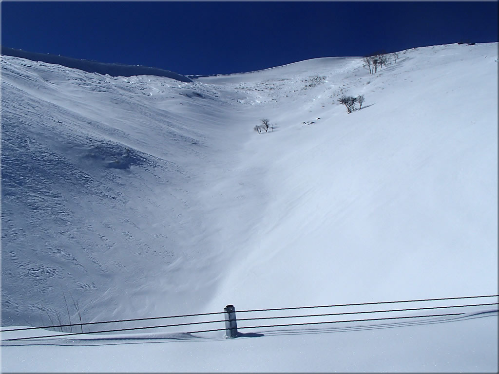 いつも滑る山頂近くの斜面も東風でたたかれた跡がはっきりと見えます。おまけに上の方は雪がかなり飛ばされてしまって、笹が広範囲に顔を出しています。