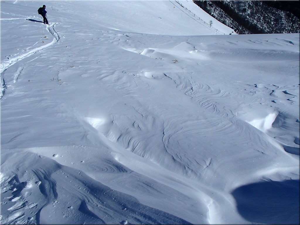 この辺りでやっと東側斜面がだんだと見えてきますが、いつもだと稜線の東側には巨大な新雪の吹きだまりや雪庇が出来ているのですが、今回は随分と小さいです。で、シュカブラの形状を良く見ると、どうも吹き荒れた強風の風の向きが西風でなく東風だったようです...。今見えている稜線東側の吹きだまりっぽいのは、実は風で吹き飛ばされなかったかちかちの雪なのでした。稜線上には柔らかい雪はどこにもありませんでした(^^;。ショックです。