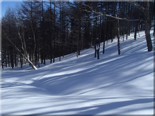 最後はちょっと斜面を切り替えてここを滑ります。北向きの斜面でいつも新雪が深い斜面ですが、今回はどうでしょう。