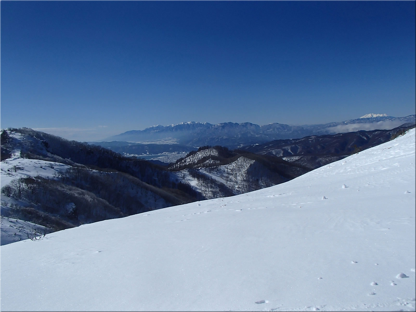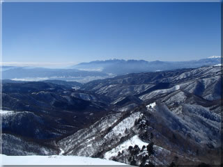 中央アルプス、そして諏訪湖も見えています。