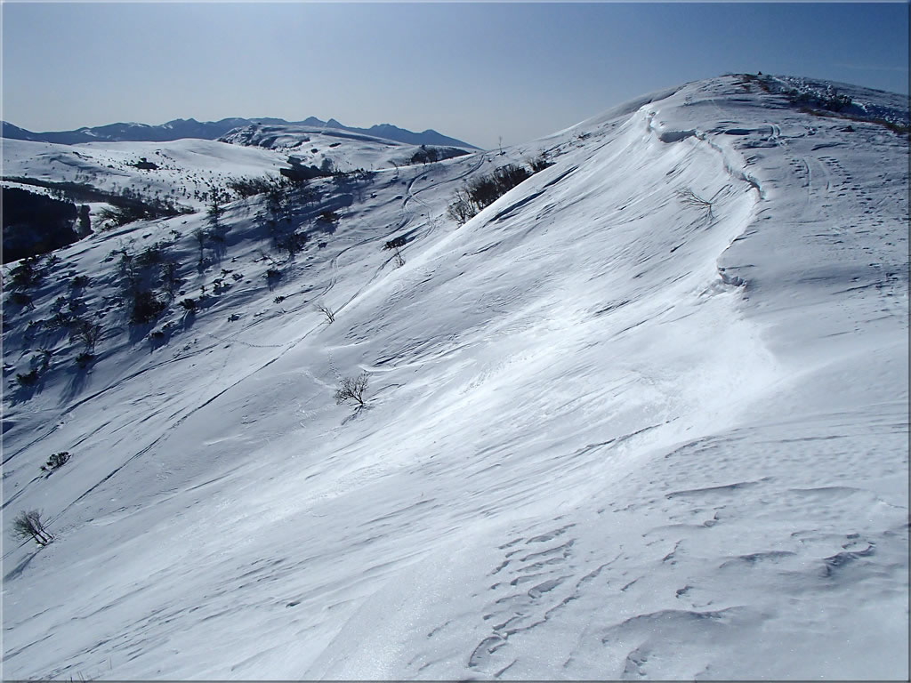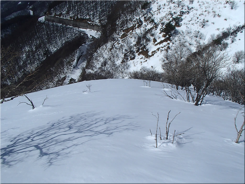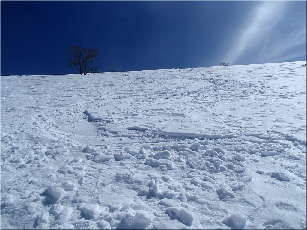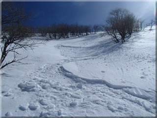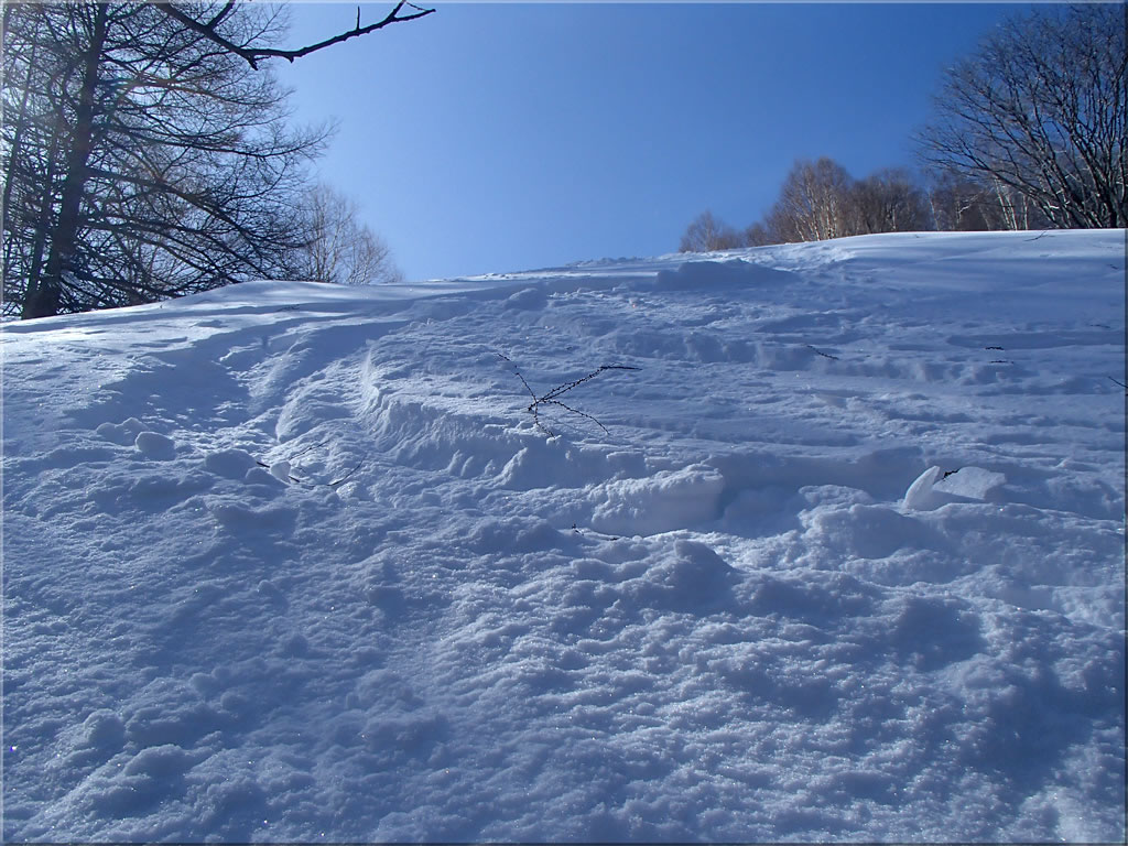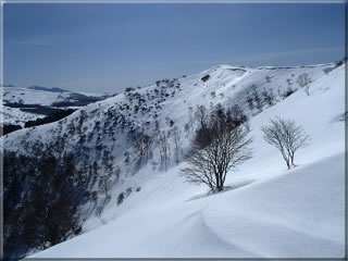 鷲ヶ峰山頂直下の東斜面の様子。この急斜面も前々回来た時に滑ってみました。ちょっとエクストリームでしたが(^^;。その時の様子はこちら。