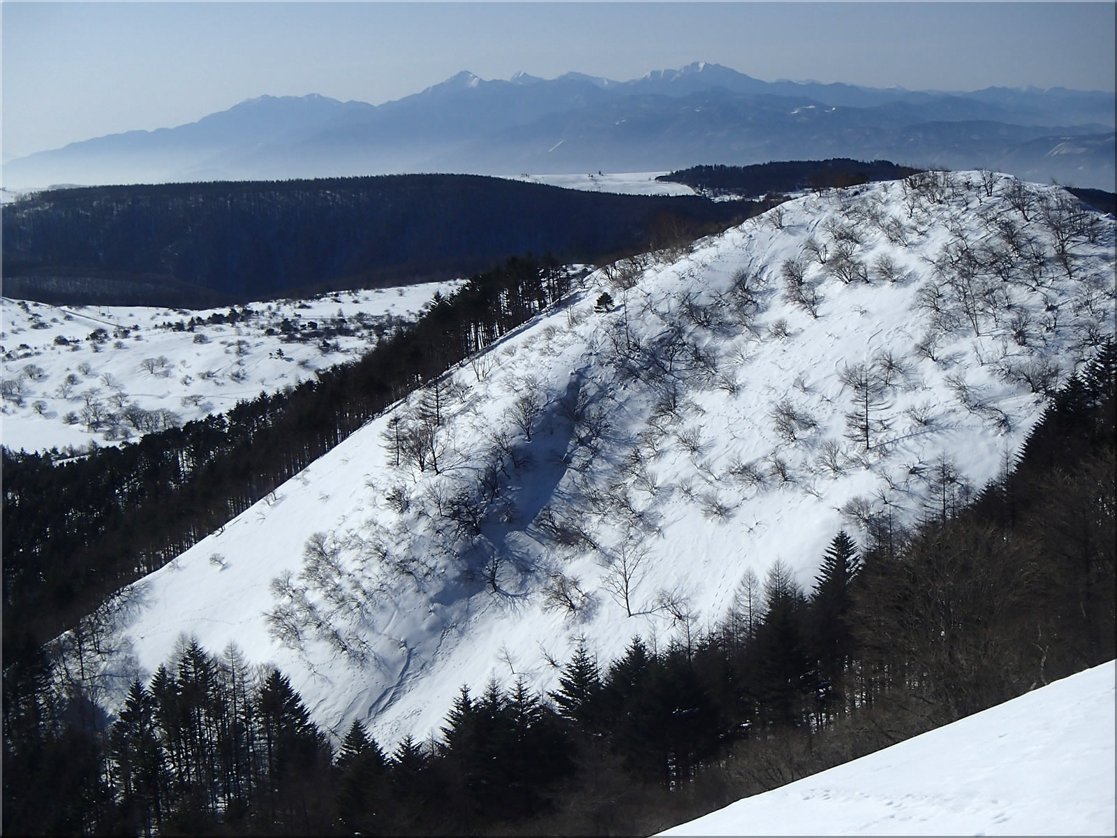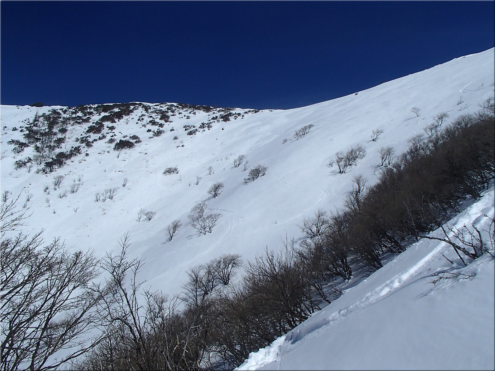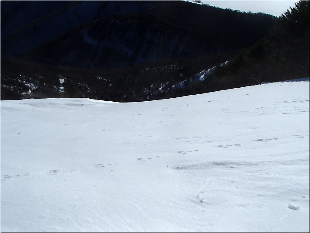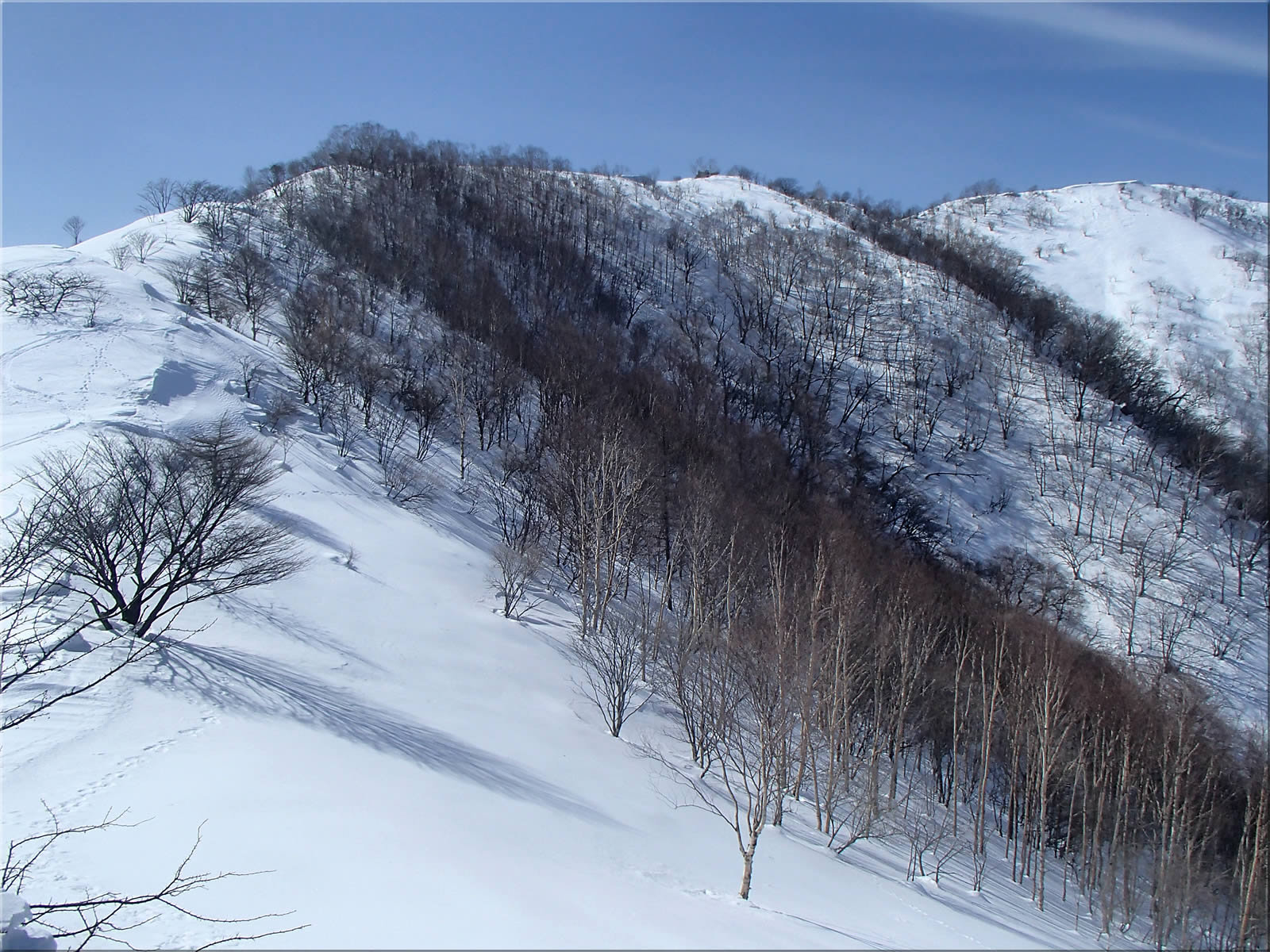 北東に延びる尾根側。あとでこの尾根上を滑り降りてみました。こちら側の斜面にもシュプールが一つ見えます。