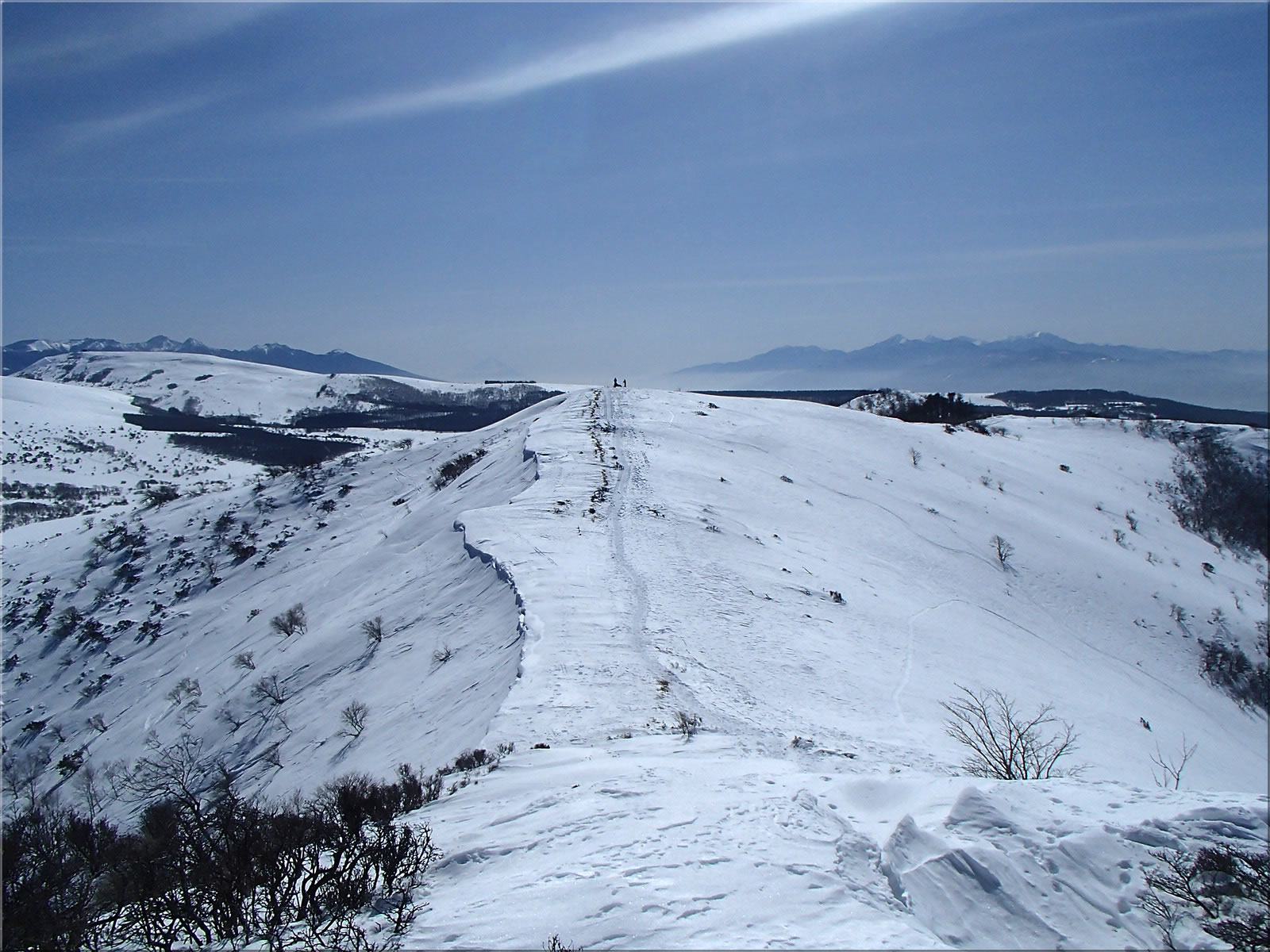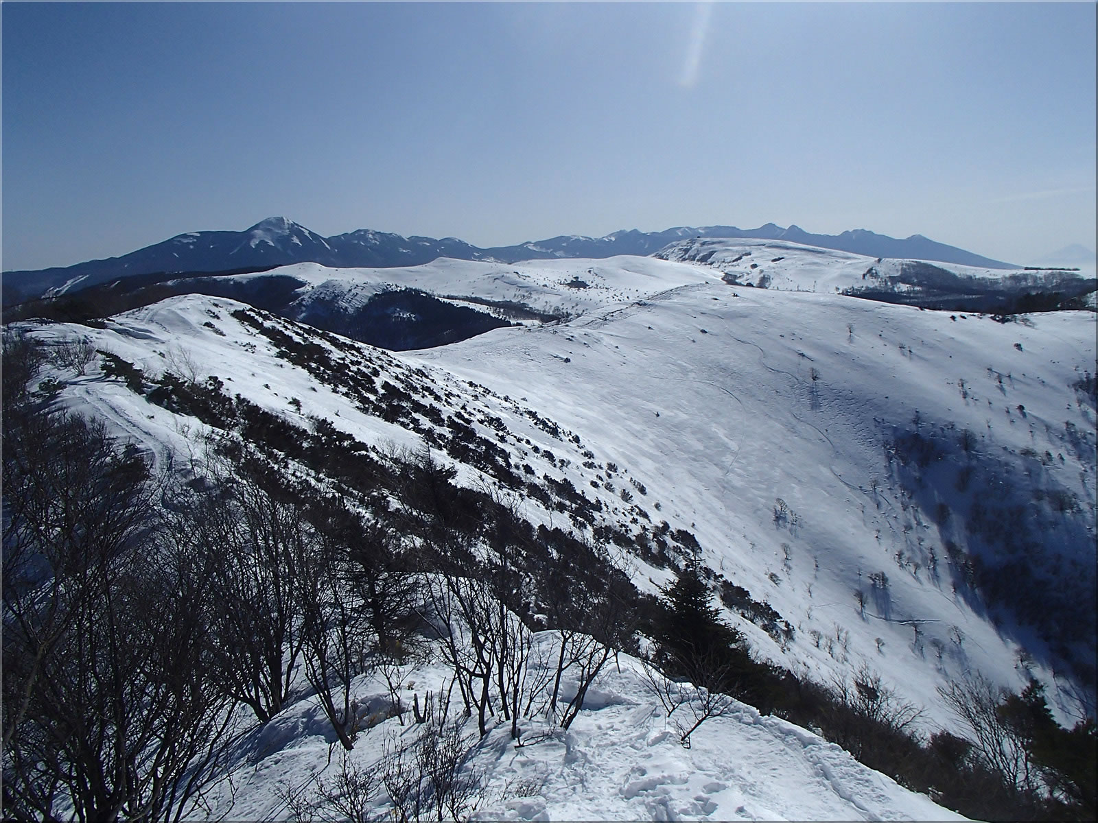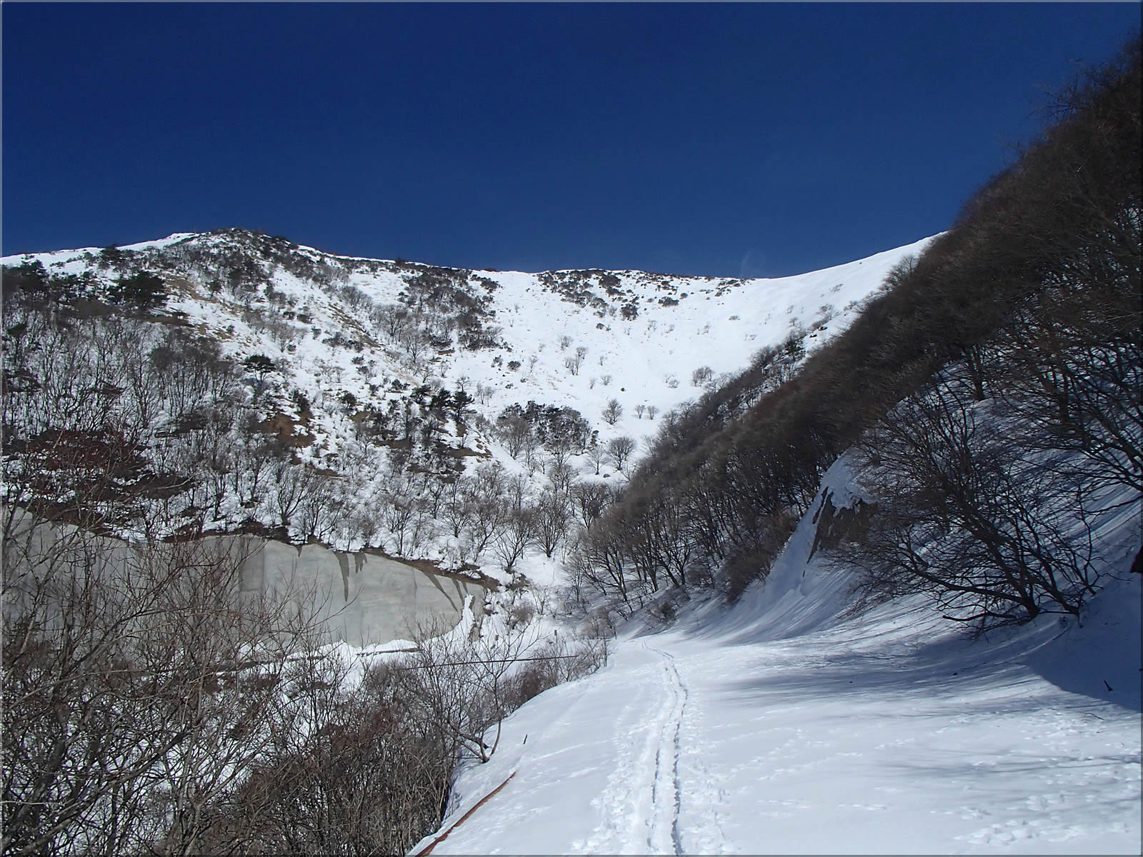 北東に延びる尾根側。あとでこの尾根上を滑り降りてみました。こちら側の斜面にもシュプールが一つ見えます。