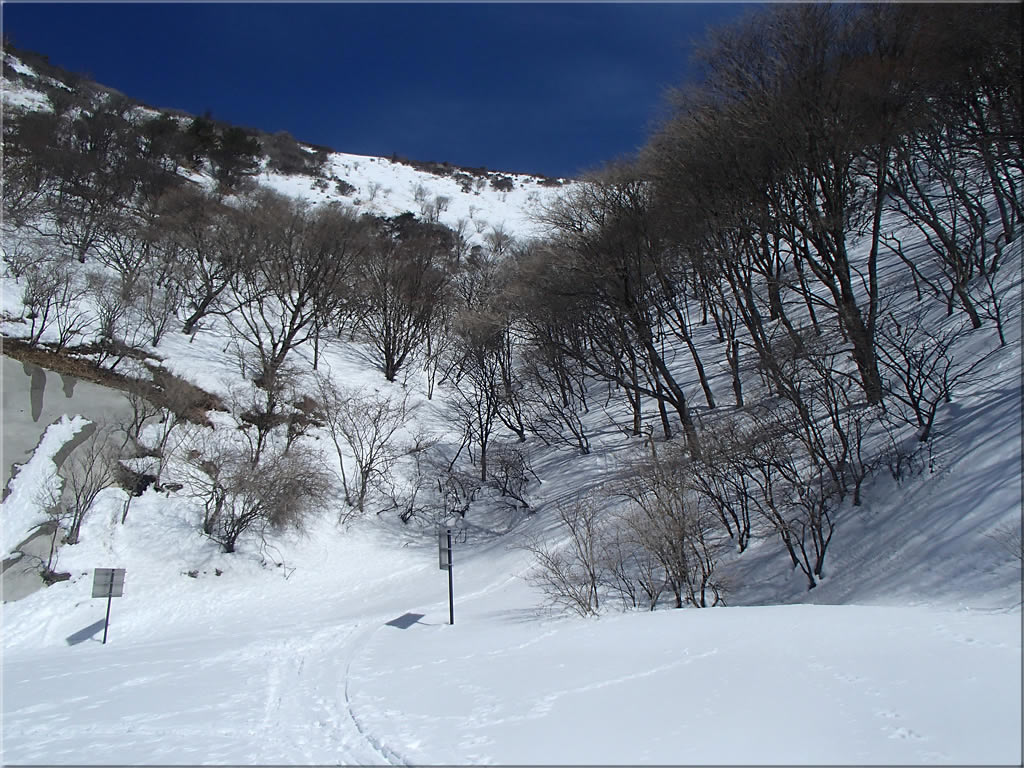 11時50分、シールで道路を歩き始めます。風もなく日射しが暑いです。ただスキーのトレースがしっかりと付いていて歩きやすいのは助かりました。