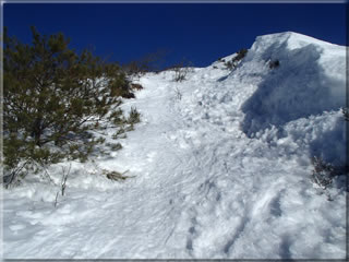 雪庇が東側に大きくせり出していませんので、おそらく先週の大雪のあと強い東風が吹いて、こちらの斜面の上部の新雪を皆吹き飛ばしてしまったのかもしれません。