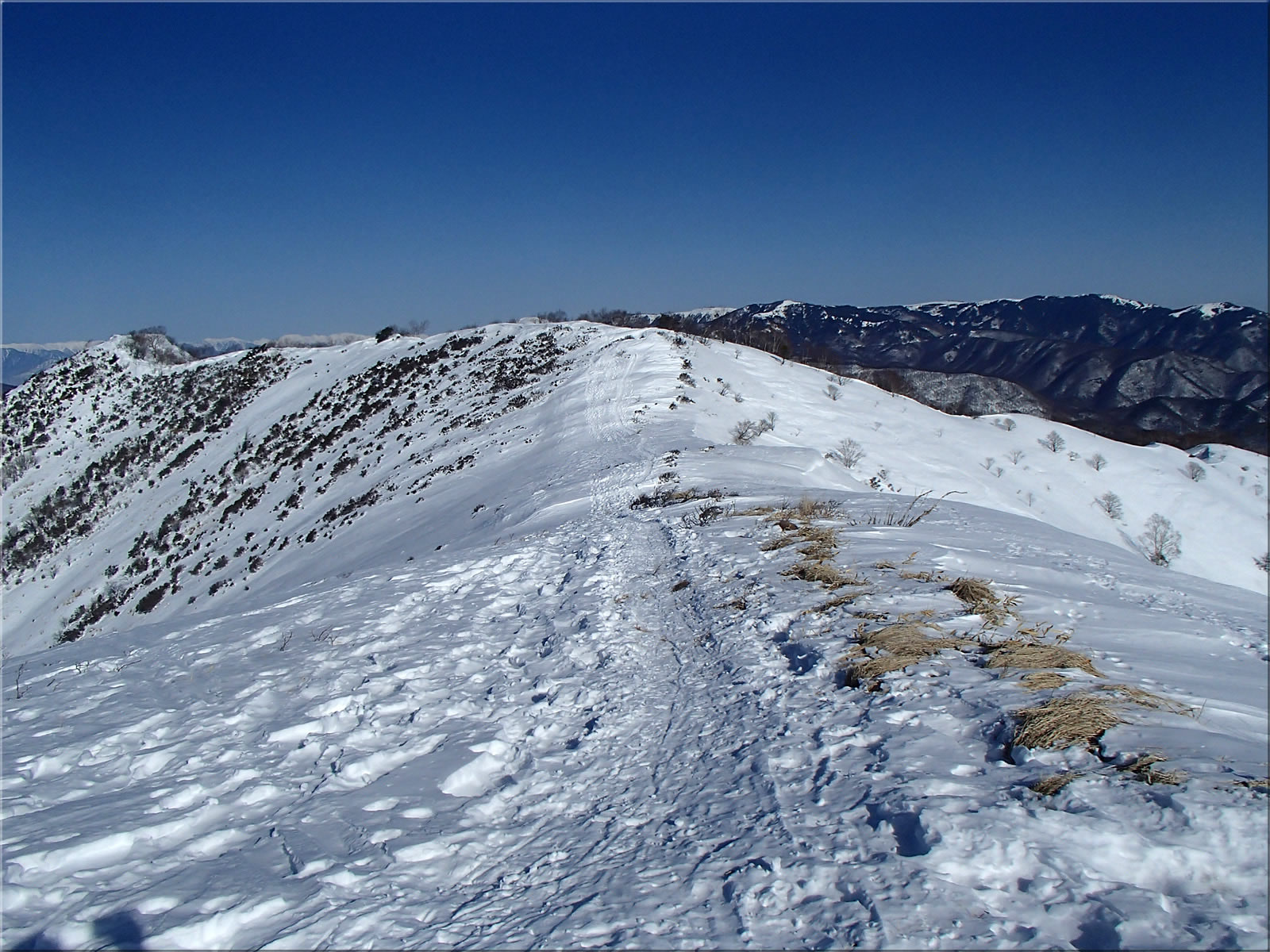 では2番目のピークに向かいます。なお写真を撮ろうと登山道から外れて少し北側に傾斜した斜面に入ってみたところ、雪はそれまでのクラストから急に柔らかい雪に変わってびっくりしました。斜面を選べば、滑りもそれなりに楽しめそうです。