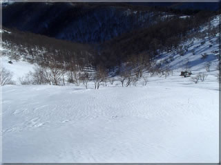 途中で真ん中の小高い尾根の隣の陽当たりの悪い斜面に移動します。ここならパウダー率は高いのですが...。