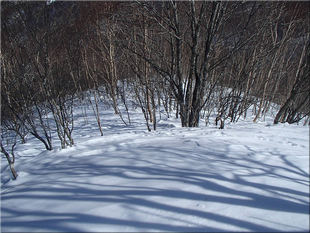 しかも斜面下部の疎林帯に入ると、なんとかちかちのバーンになってしまいました。滑落しないように慎重に滑り降りていきます。