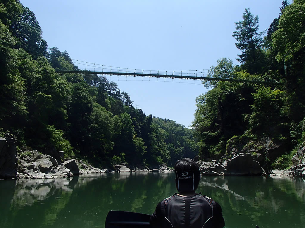 瀬の入り口をズーム。流れの本流はその先で一番右側の橋脚に当たっていますので、その左側を通るようにコントロールしながら下っていきます。ちなみにここは船下りもあるため、本流を行けば底を擦ってしまうような浅瀬はありません。