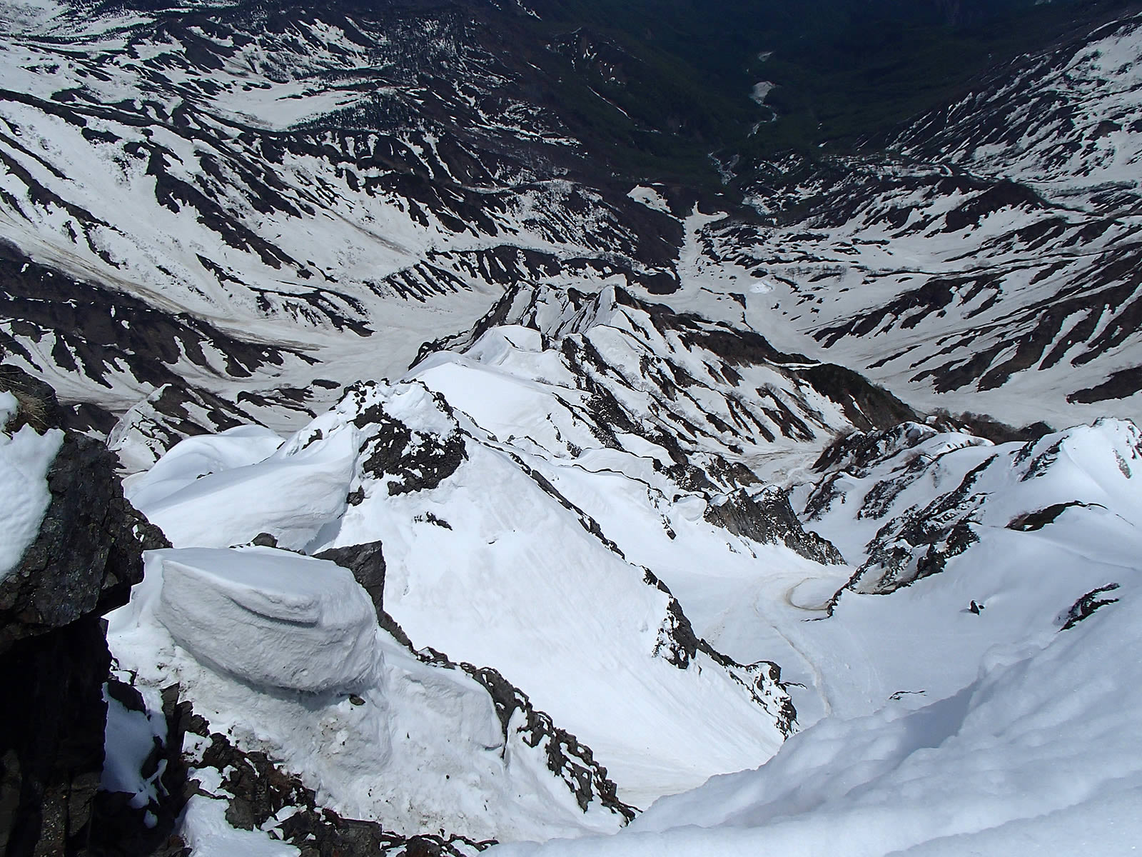 東側には巨大な雪庇が張り出しています。怖くてあまり近づけません。