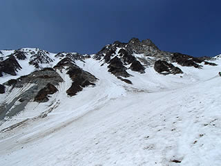 長走沢出会い。まだ橋が架かっておらず、水量が多いので、上流側に少し登って雪渓の上を渡りましたが、そろそろ雪が薄くなってきていますので、渡っているときに雪が割れないかとどきどきしました。