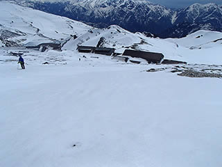 続いて白馬山荘下の斜面に向かいますが、ここも板を脱ぐことなく下の雪渓に出ることが出来ました。