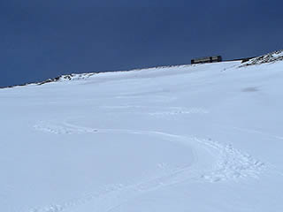 ここで今日最初のスキーヤーが上から滑り降りてきました。今朝麓から出発して山頂まで登ったとしたら恐ろしく早いです。
