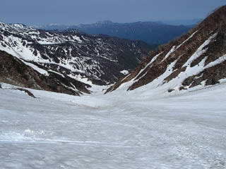 大雪渓ですが、雪の上に小石がかなり目立ち、もう大雪渓の下半分は快適に滑るというわけにはいきそうにありません。実際にも帰りは石を踏みまくりでした。