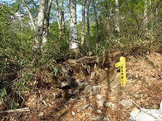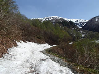 林道終点部からは残雪で覆われた斜面をトラバース気味に進んでいきます。後から思えば、ここから白馬岳山頂までは雪がつながっていました。