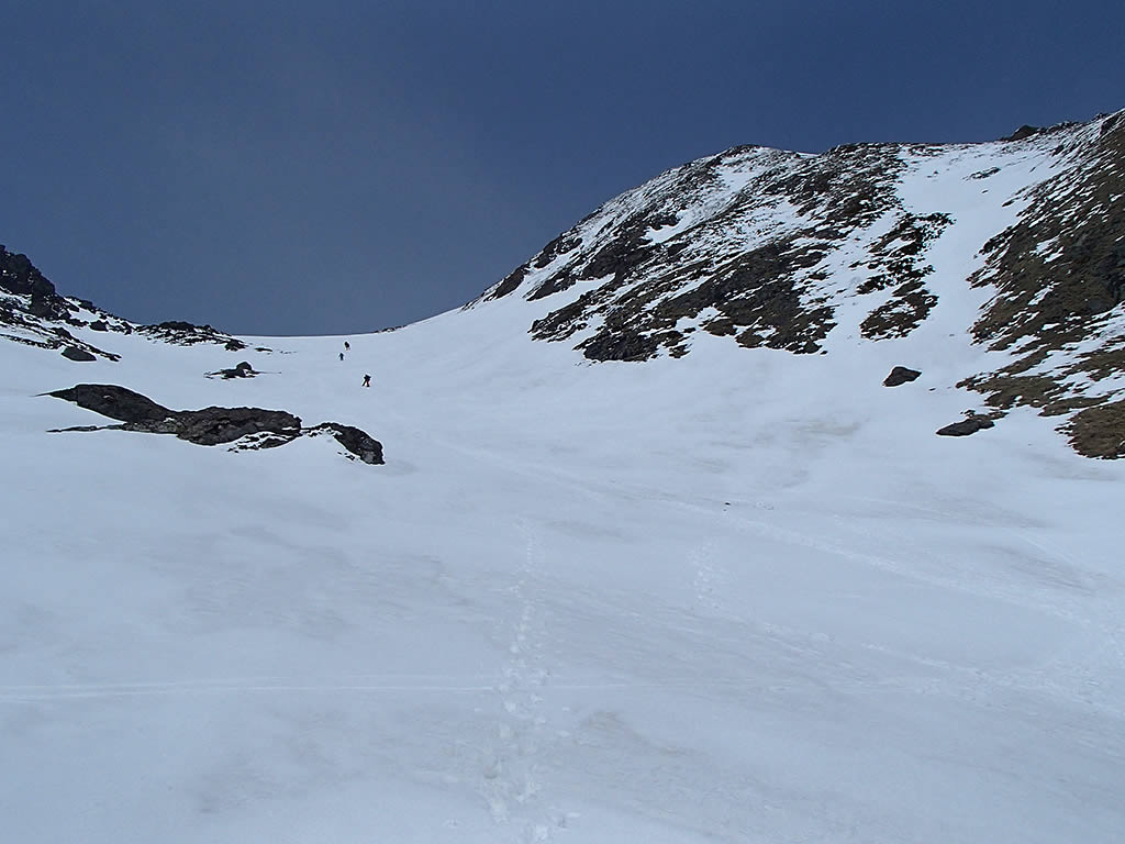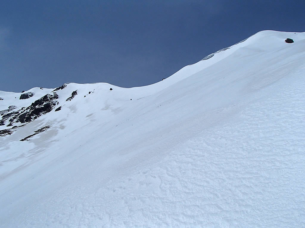 登っている右側の斜面。写真はなだらかそうですが、上を向いて撮影していますので、実際には30度から35度くらいはある急斜面です。