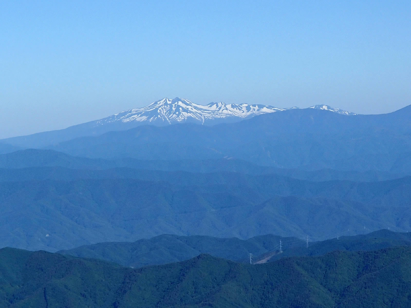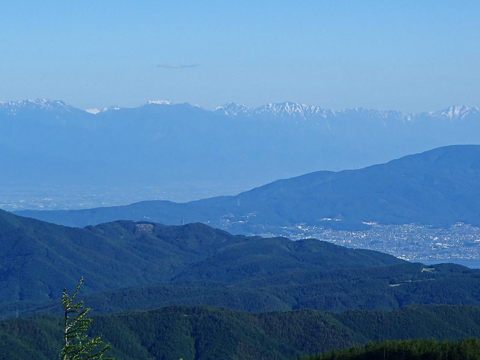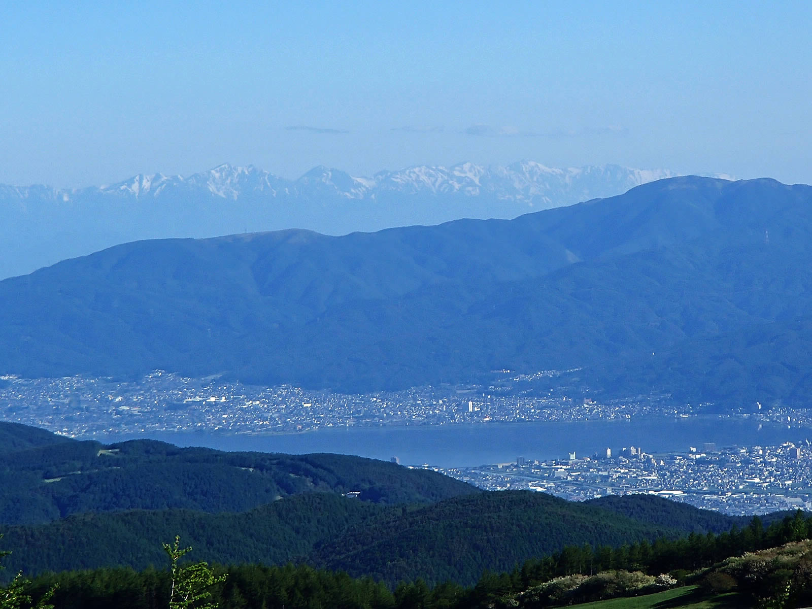 北アルプス北部をズーム。爺ヶ岳から白馬岳のあたり。手前に諏訪湖も見えています。