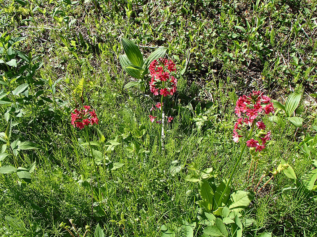 林道を入笠湿原方向に進み、山彦荘を通り過ぎて少し行ったところにあるくりん草の群落を見ていきます。道路脇にこれだけ咲いています。入笠湿原内にはぽつぽつという感じなので、入笠湿原に来られた方はぜひここまで足を伸ばすことをおすすめします。(山彦荘から歩いて3分ほど)