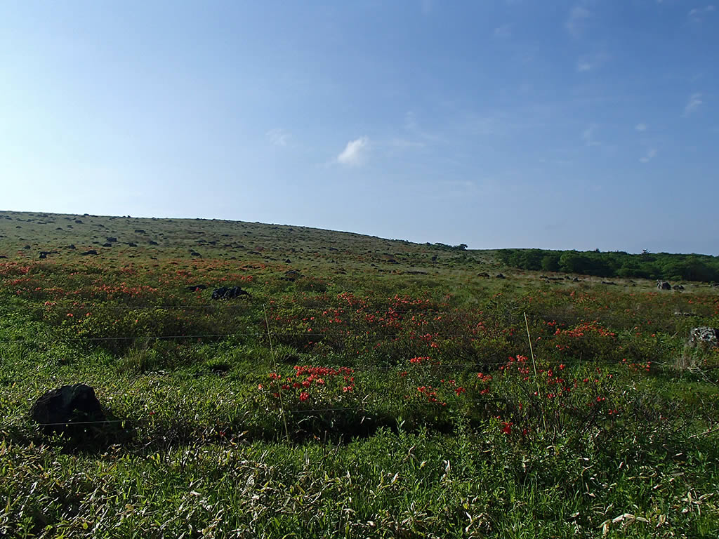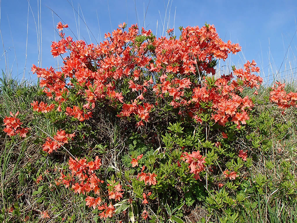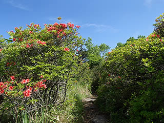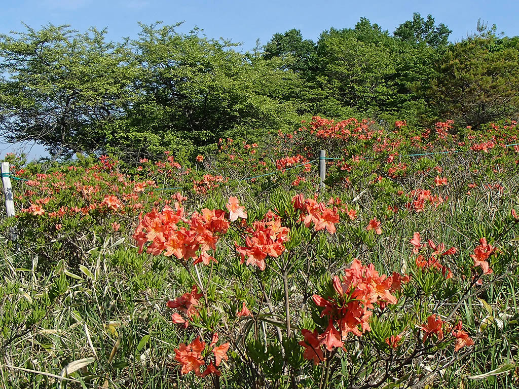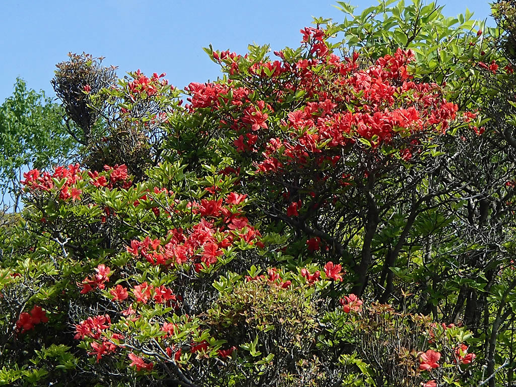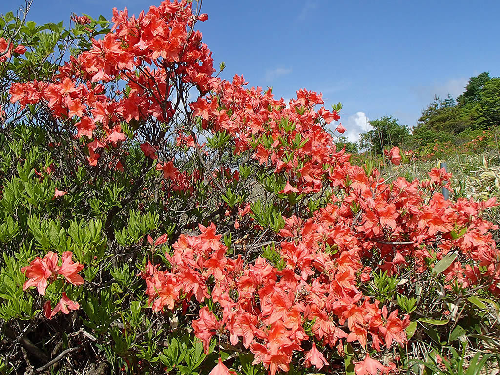 稜線の登山道脇のつつじは山つつじと思われます。ダイダイ色よりは少し赤が濃い感じです。