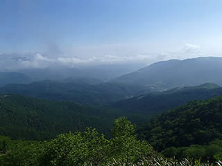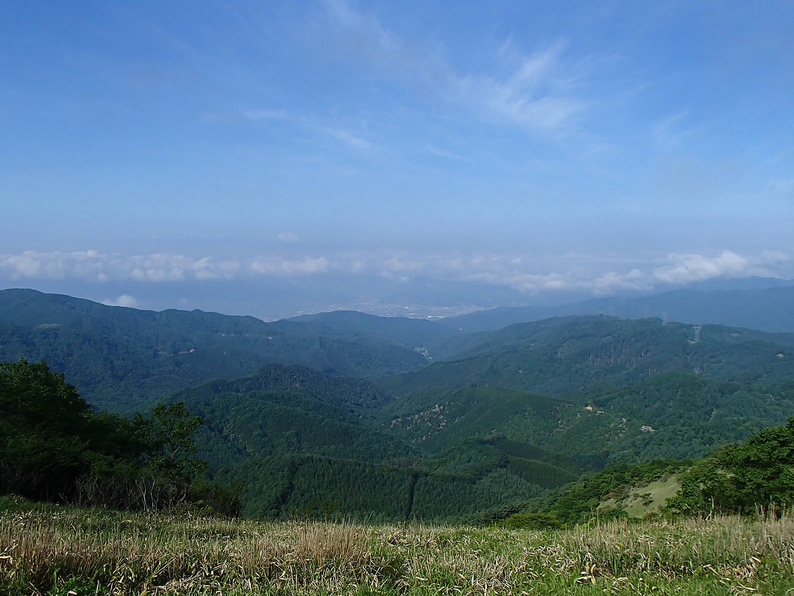 最初のピークに着くと西側の展望が広がります。ただし上空は青空ながら遠くはかすんでよく見えません。
